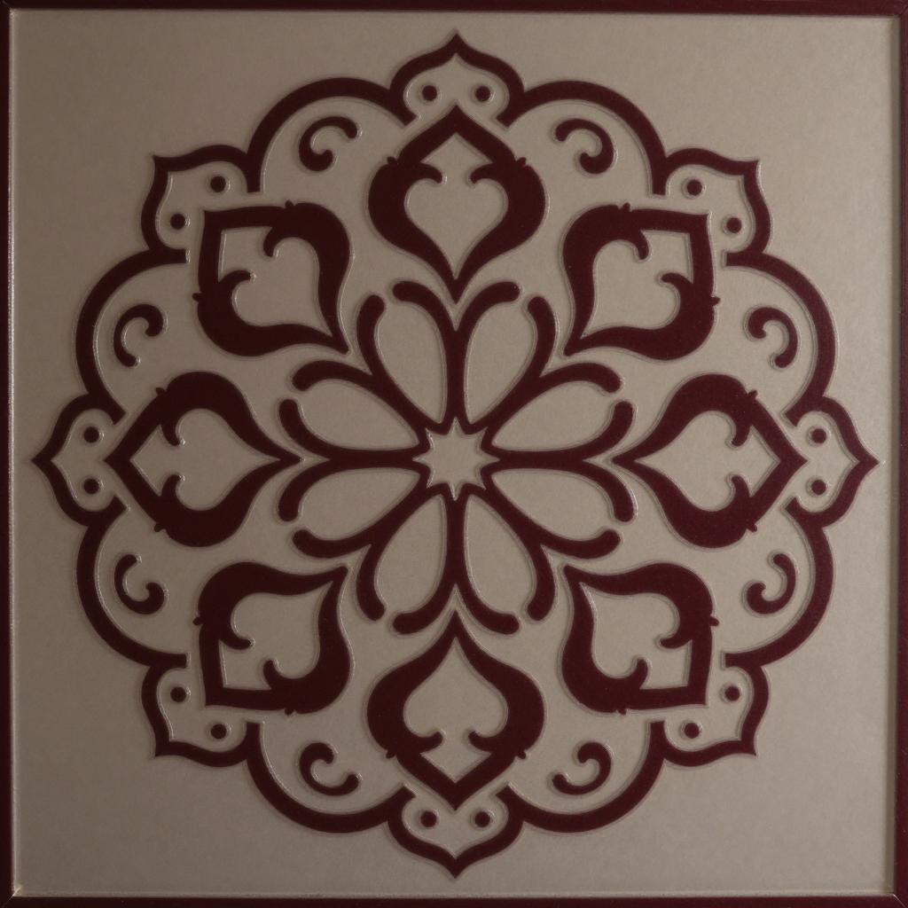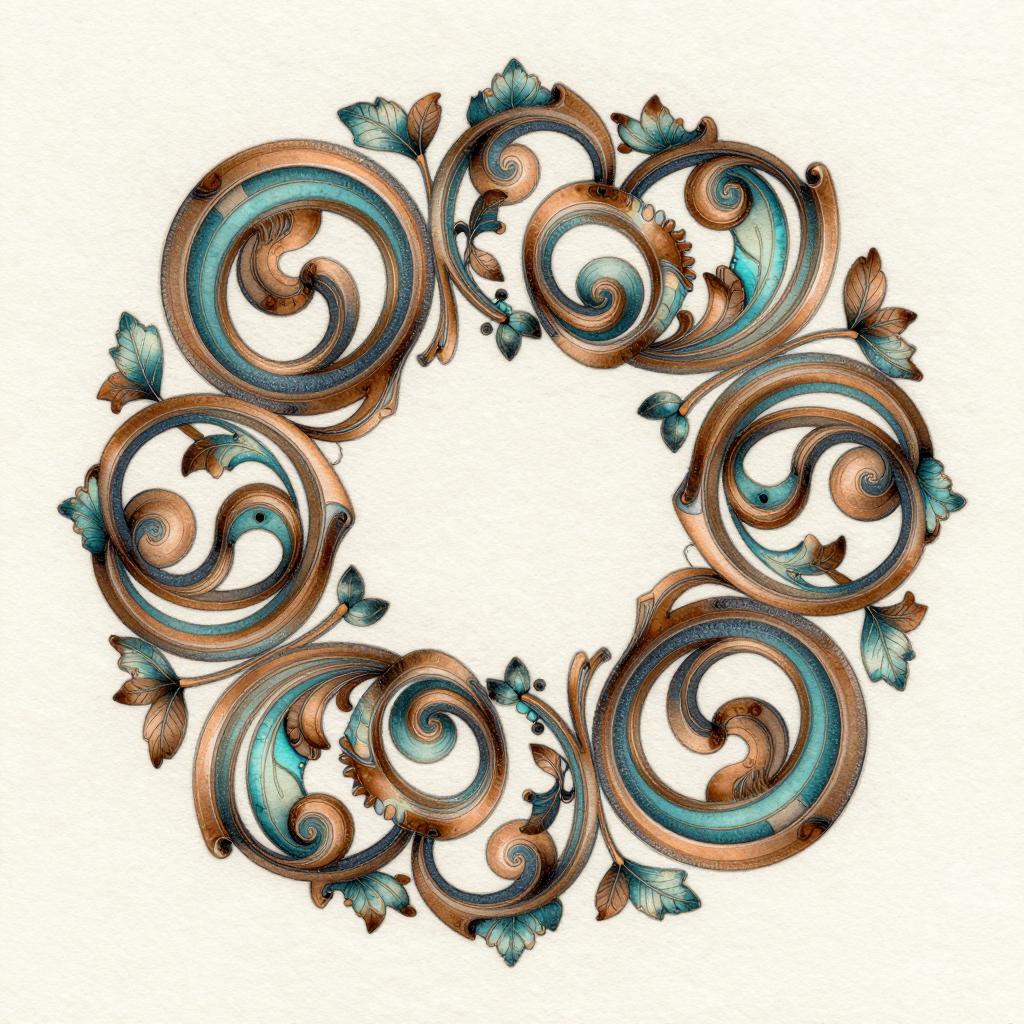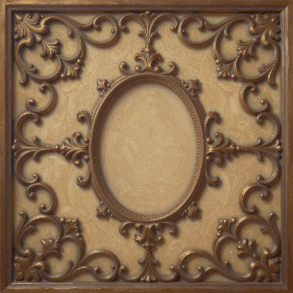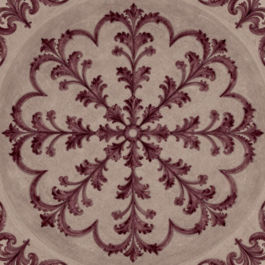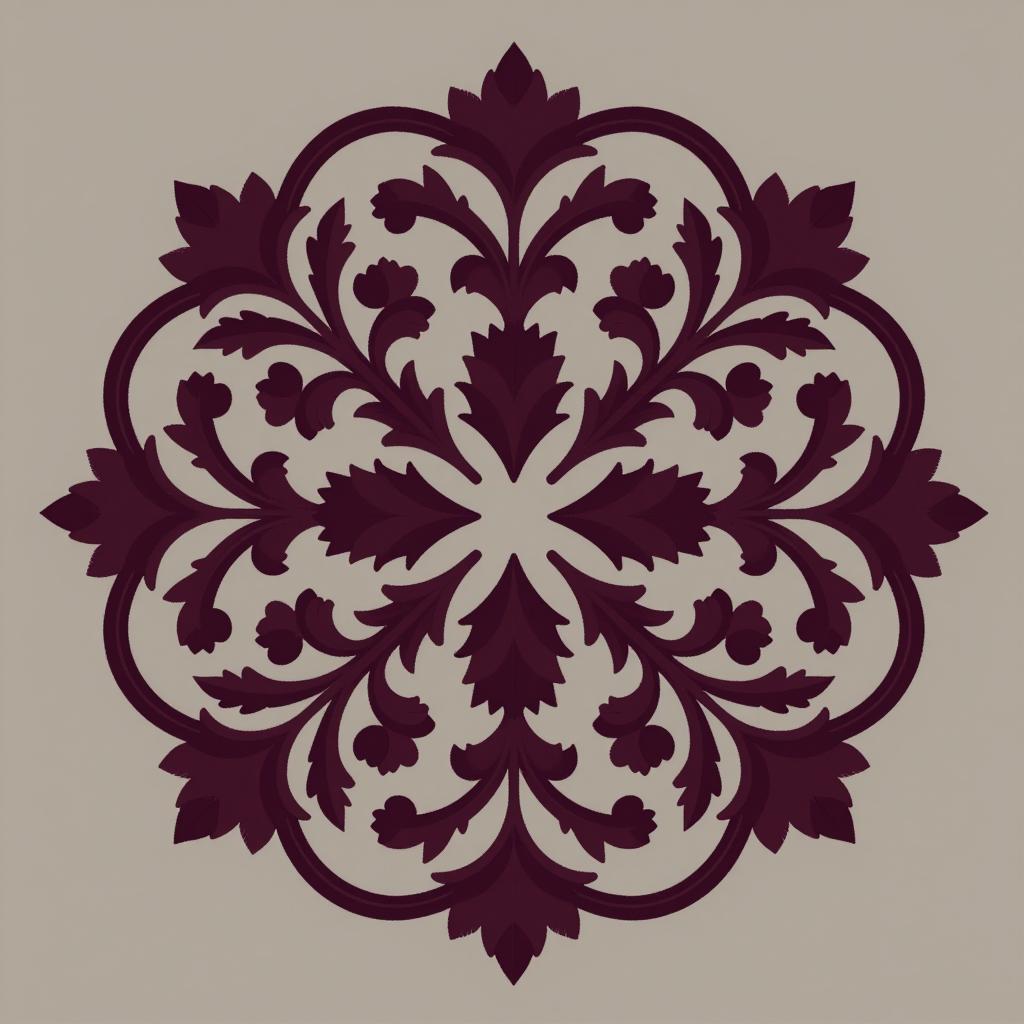 Scrollworks pattern featuring dense Baroque acanthus leaves and curling vines in deep burgundy scrollwork on muted taupe arranged as central circular medallion of scrollwork on a plain field on ceiling or dome decoration in an old palace rendered as watercolor wash background with sharp line-art scrolls, ultra-detailed, sharp ornamental design, high resolution, intricate decorative pattern art