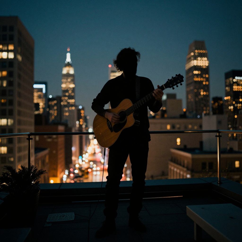 Silhouetted musician with an acoustic guitar stands on a rooftop against a twilight cityscape, illuminated skyscrapers, and glowing streetlights.