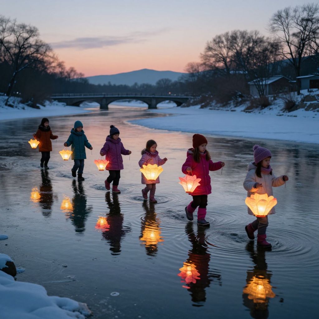 Six children, each wearing winter coats and illuminated by square paper lanterns atop their heads, walk hand-in-hand across a frozen river, leaving trails of glowing golden lights that transform into delicate flower patterns on the icy surface beneath them.