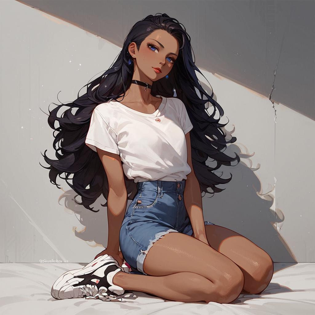 Digital artwork of a dark-skinned girl with long flowing black hair and blue eyes. She is wearing a white t-shirt, denim shorts, and sneakers, accessorized with a black choker. The girl is seated with a confident pose, looking directly at the viewer, set against a plain light background.