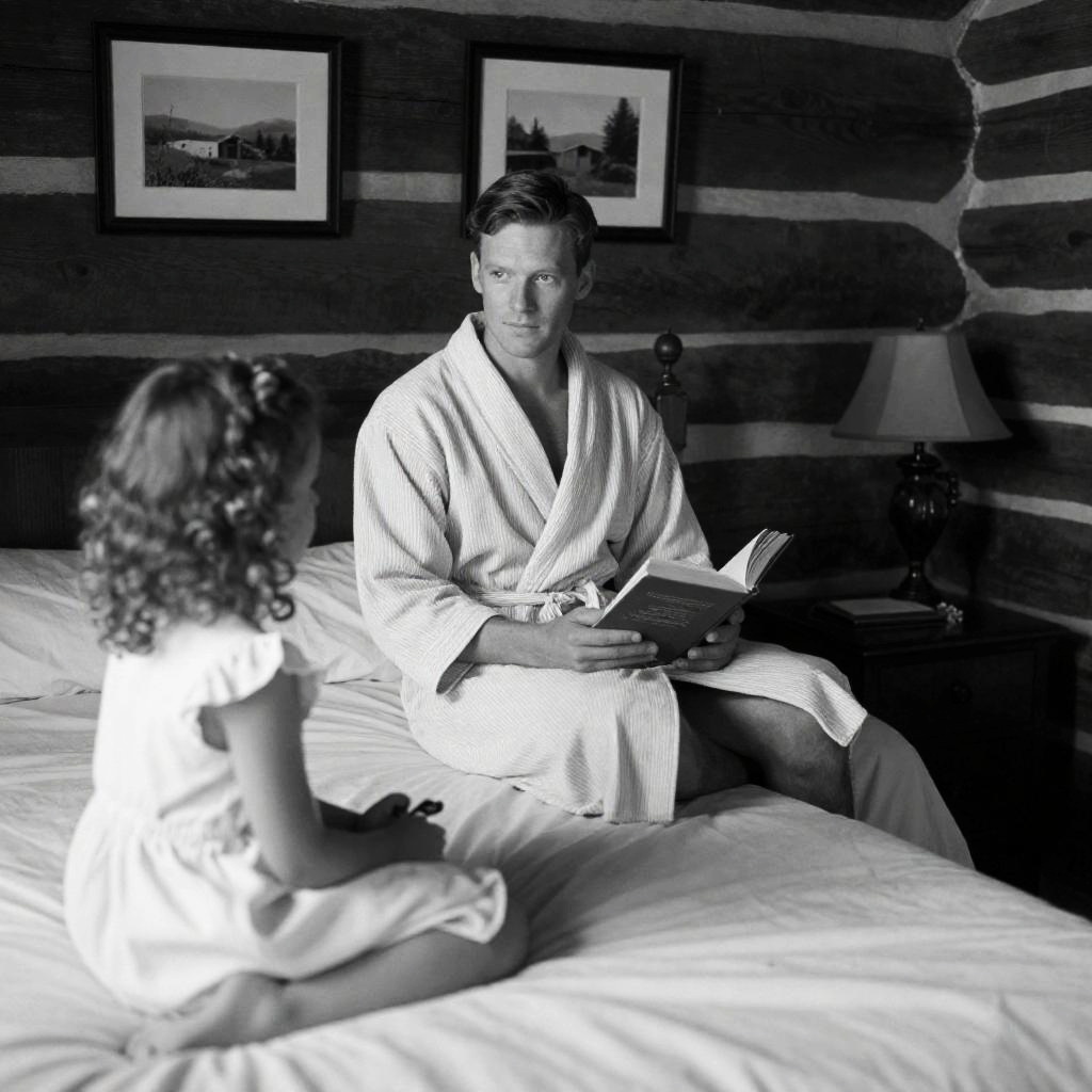 Black-and-white photograph of a log cabin bedroom. A man in a striped robe sits in bed, holding a book, looking at a young girl with curly hair in a white dress, sitting on another bed in the foreground. Two framed pictures on the log wall. The man has a neutral expression, the girl's face is out of focus.