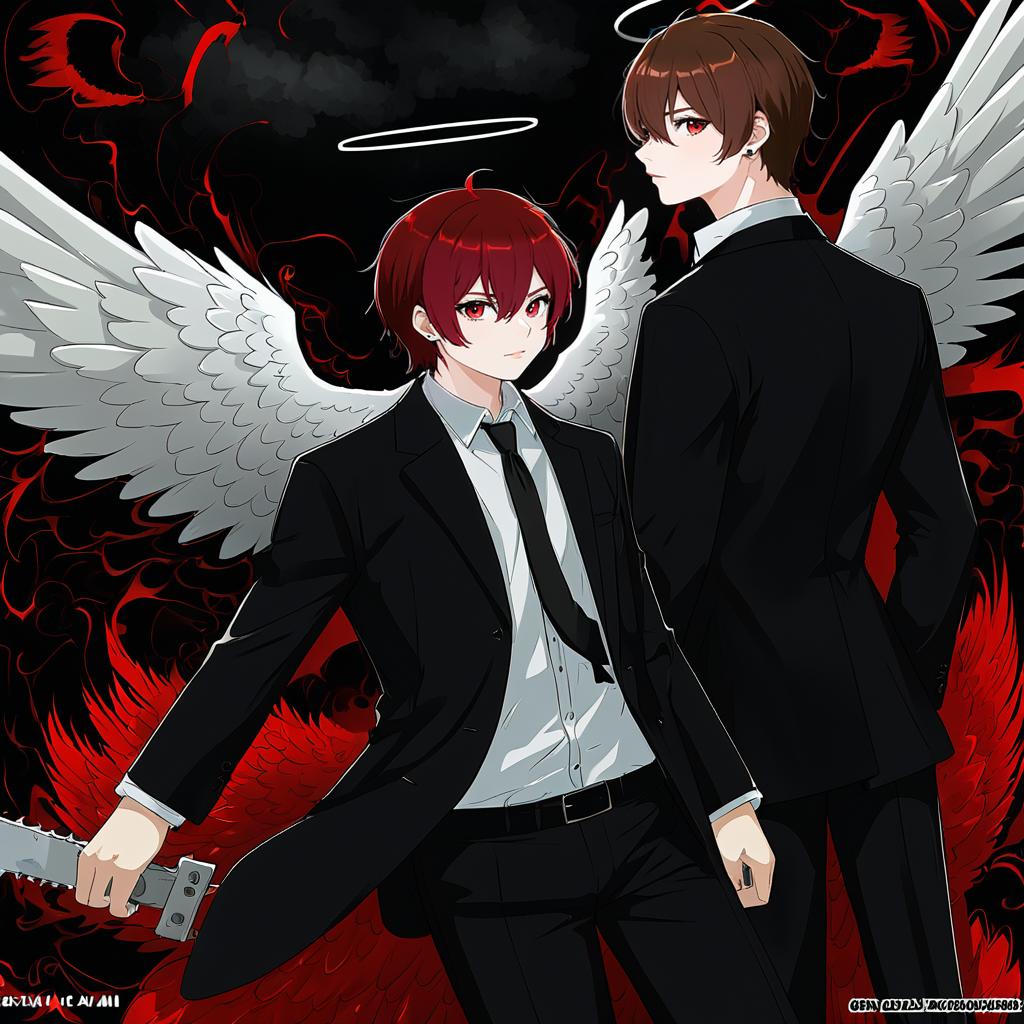 Digital anime illustration featuring two male angel characters with white feathered wings and halos, dressed in black suits, white shirts, and black neckties. One character has short red hair with red eyes and holds a chainsaw, while the other has medium brown hair and a serious expression. The dark, dramatic background incorporates red and black tones, enhancing the supernatural and formal theme.