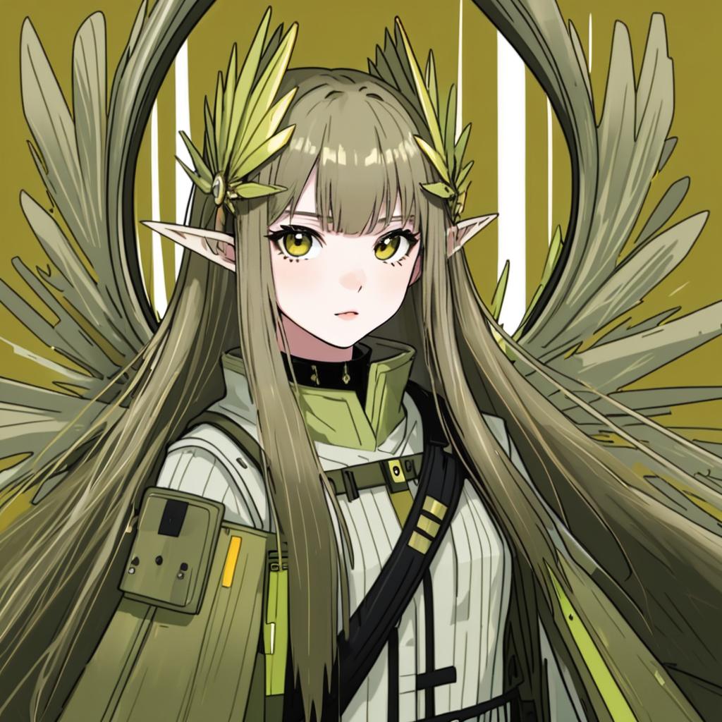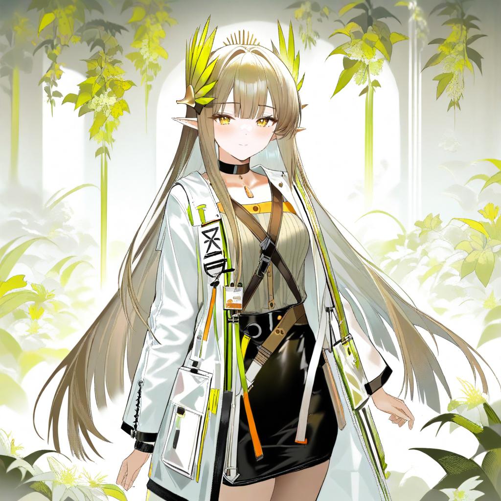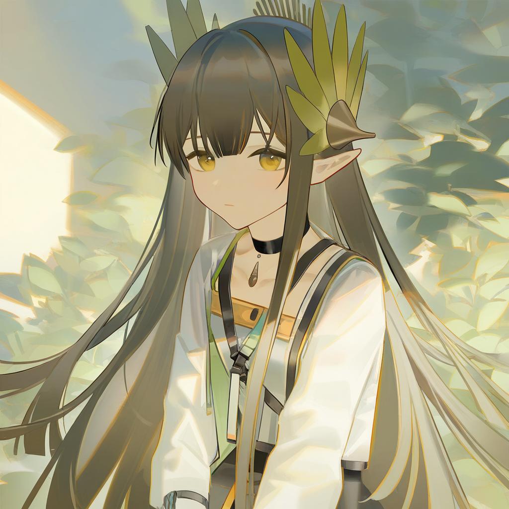 Muelsyse (arknights), arknights, 1girl, pointy ears, yellow eyes, mole under eye, very long hair, brown hair, long hair, long sleeves, black choker, elf, by artist nora higuma, animagine