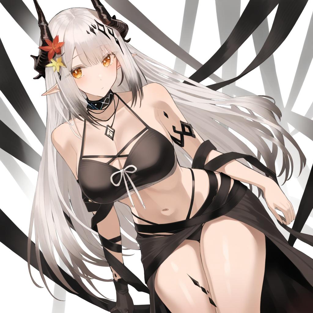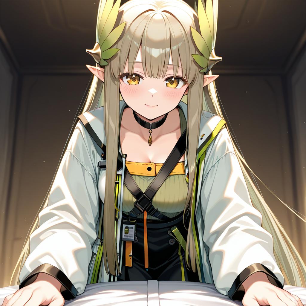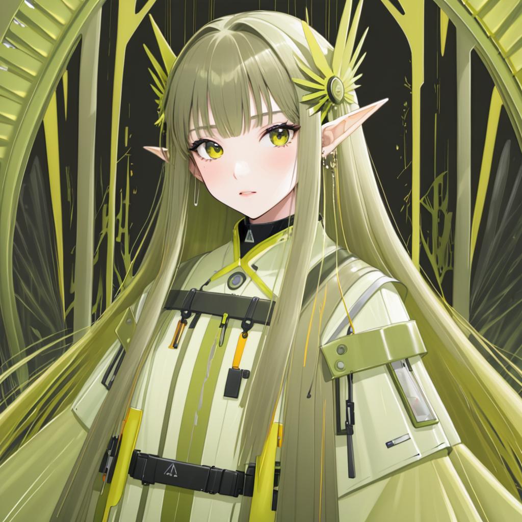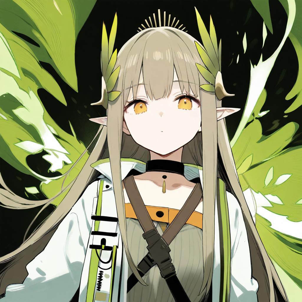 Muelsyse (arknights), arknights, 1girl, pointy ears, yellow eyes, mole under eye, very long hair, brown hair, long hair, long sleeves, black choker, elf, by artist nora higuma, animagine