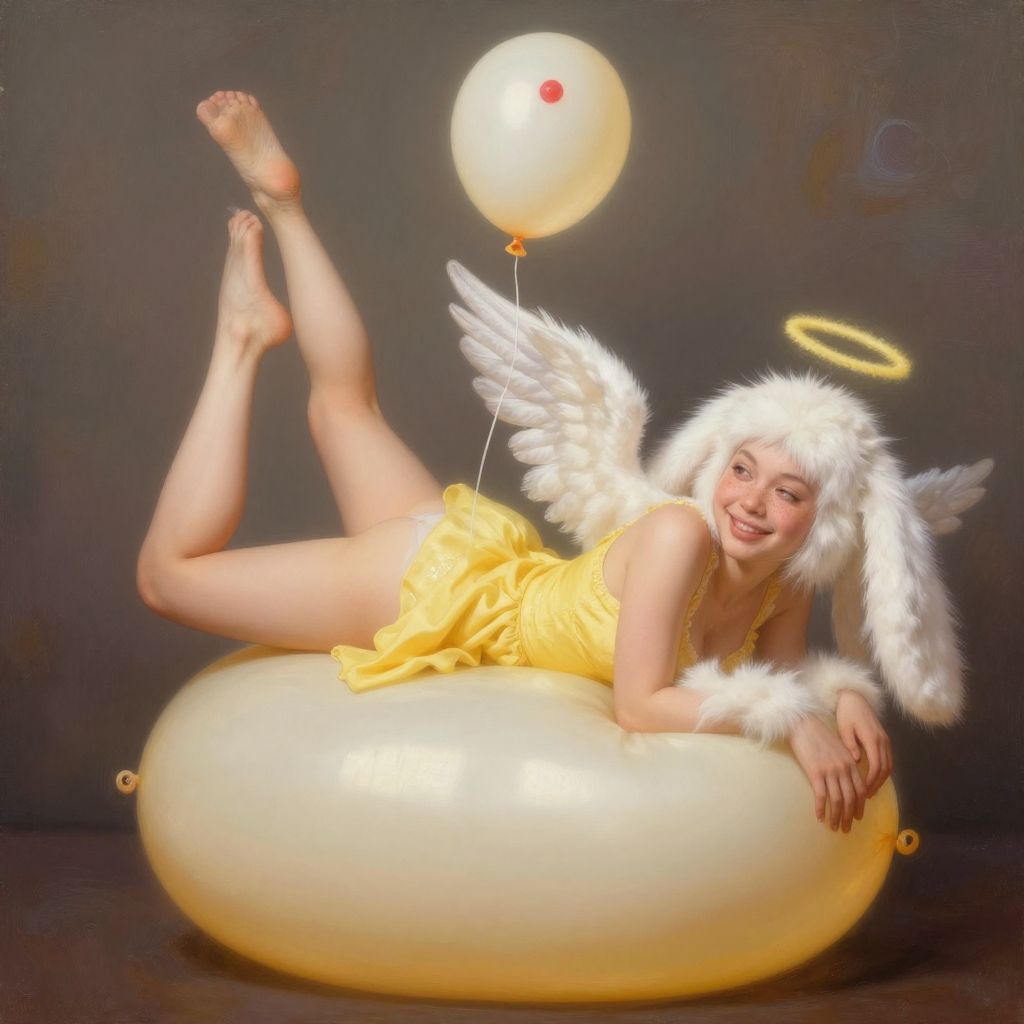Score_9, score_8_up, score_7_up, score_6_up, score_5_up, score_4_up, female, bunny, rabbit, angel gabby, smile, angel, wings, halo, white fur, yellow dress, freckles, feral, semi-anthro, lidded eyes, seductive, naughty face, from side, from below, lying down, lying forward, on front, intimate, on balloon, against balloon, straddling, raised leg, paw, bottom of paw, bottomless, featureless crotch, dynamic view, big balloon, detailed balloon, realistic balloon, balloon knot, trying to pop a balloon, looner, balloon, sitpop, balloon fetish, straddling a balloon, squishy balloon, soft balloon, squish, bouncing, stretchy, red nosecute, glowing, foreshortening, detailed backgroundabstract background, splash screen, title card, promotional art, extra detailed, confident pose, dynamic angle, questionable, rating questionable, public, detailed, painting, realistic, solo, cute, open mouth, looking at viewer, glittery clothes, calming, relaxing, close up, extreme foreshortening, (foreshortening:1.2)