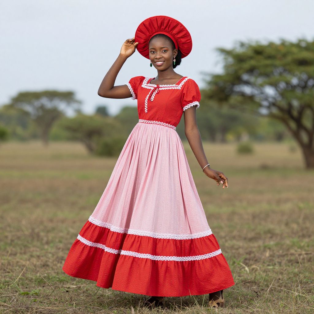 Sepedi Attire Woman Costume, woman in a red and pink dress and a red hat