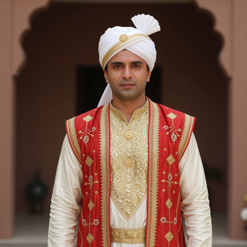 Indian Prince Costume, a man in a white turban and red and gold outfit