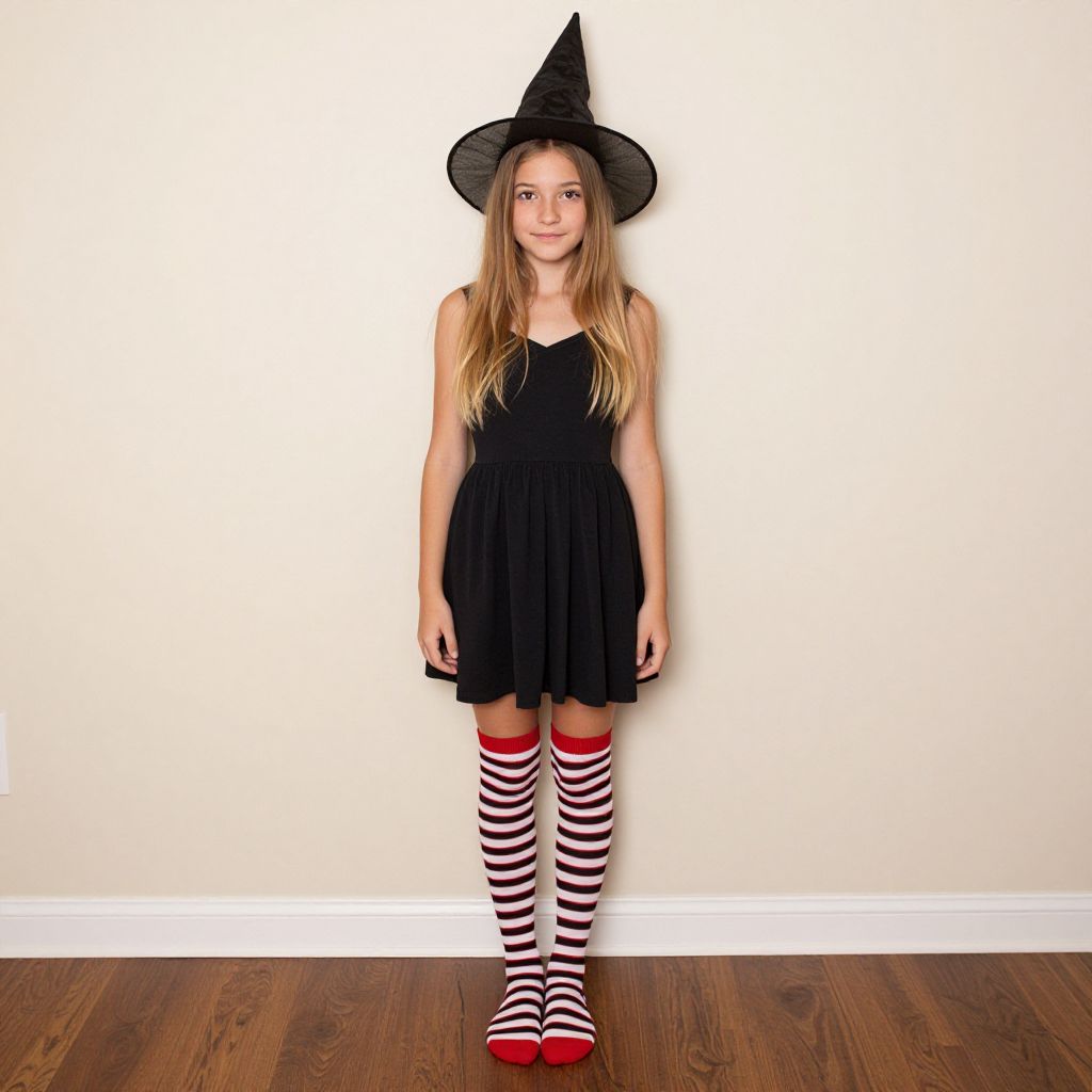 Photograph of a young girl with long blonde hair, wearing a black witch hat, black dress, and striped red-and-white knee-high socks, standing