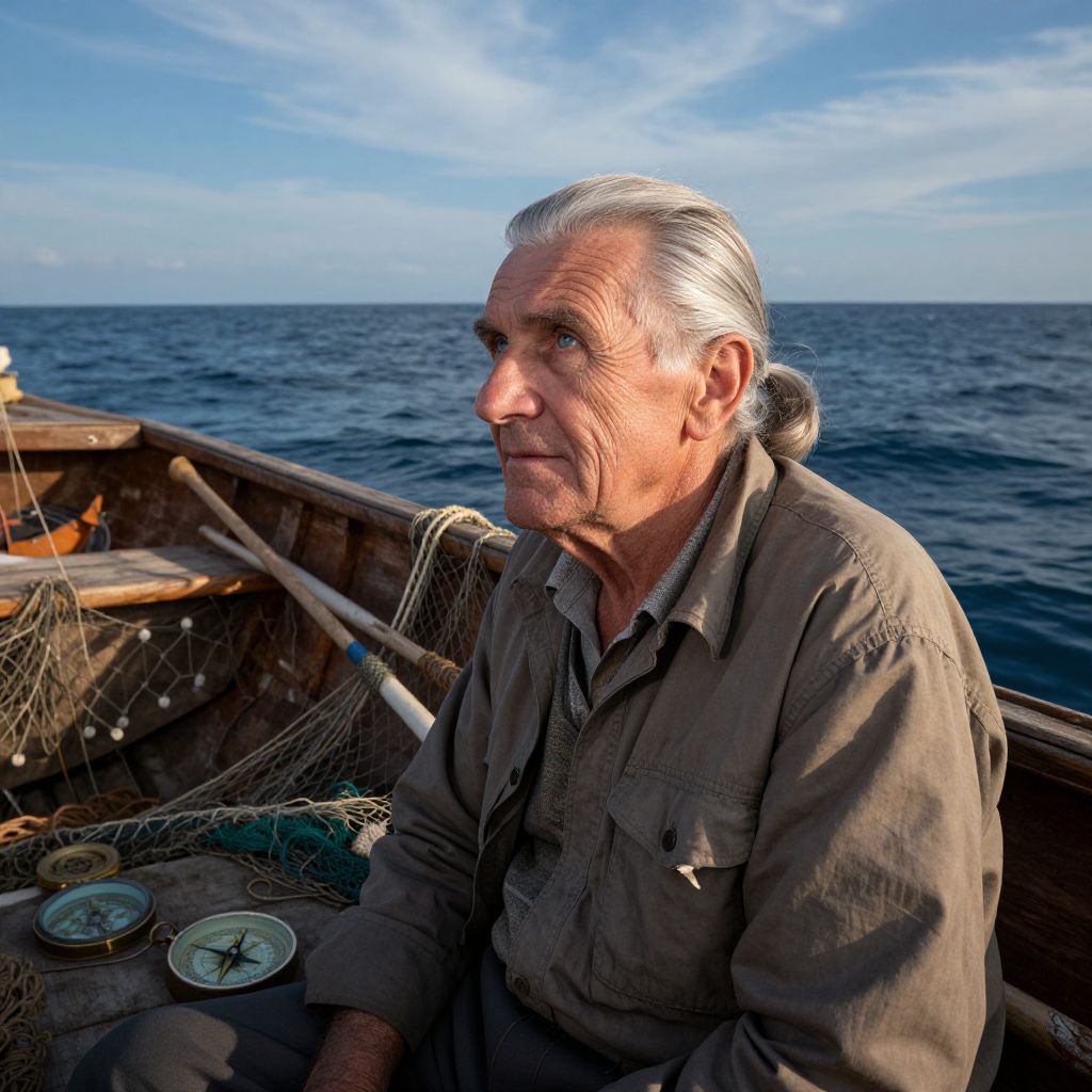 Photograph of an elderly white man with silver hair tied back in a low ponytail, wearing a beige, long-sleeved shirt. He sits in a wooden fishing boat on a calm, blue ocean under a clear sky with wispy clouds. His weathered face has deep wrinkles and he gazes thoughtfully to the right. In front of him, fishing nets and equipment, including a compass, are visible. The boat's wooden texture contrasts with the smooth water and bright sky, creating a serene maritime atmosphere.