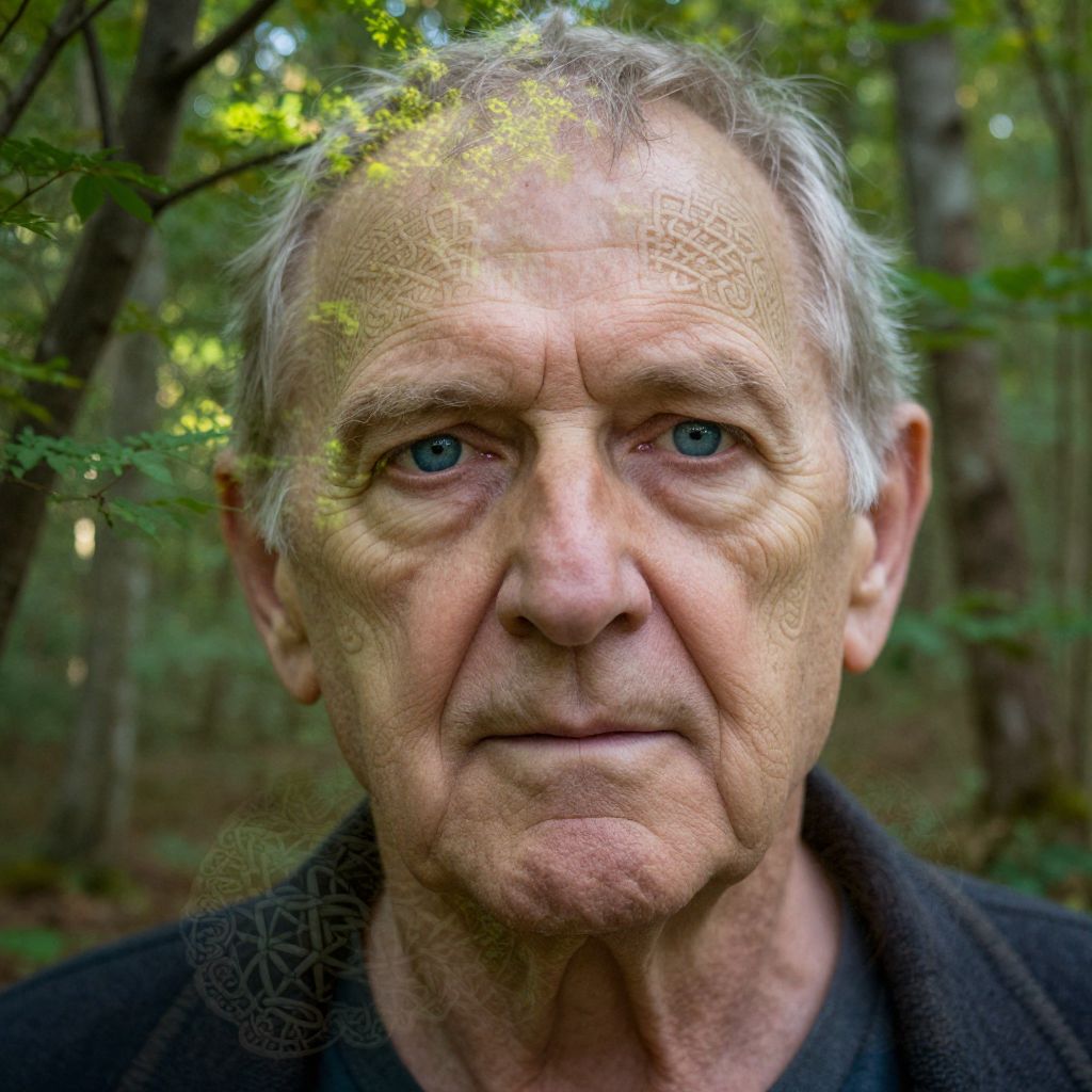 A visually striking double exposure portrait showcases an older gentleman with a pensive expression, his features subtly blurred and intertwined with intricate Celtic knot patterns. The secondary image—a lush forest with vibrant green foliage and dappled sunlight filtering through the canopy—gracefully overlays the man's face, creating a surreal fusion that exudes timeless wisdom. His piercing deep blue eyes seem to connect him to nature's eternal cycle as if they hold secrets whispered by the leaves themselves. The seamless blend of these two worlds captures an exquisite balance between the tangible and ethereal, inviting viewers on a captivating journey through life's mysteries and the interconnectedness of all things.