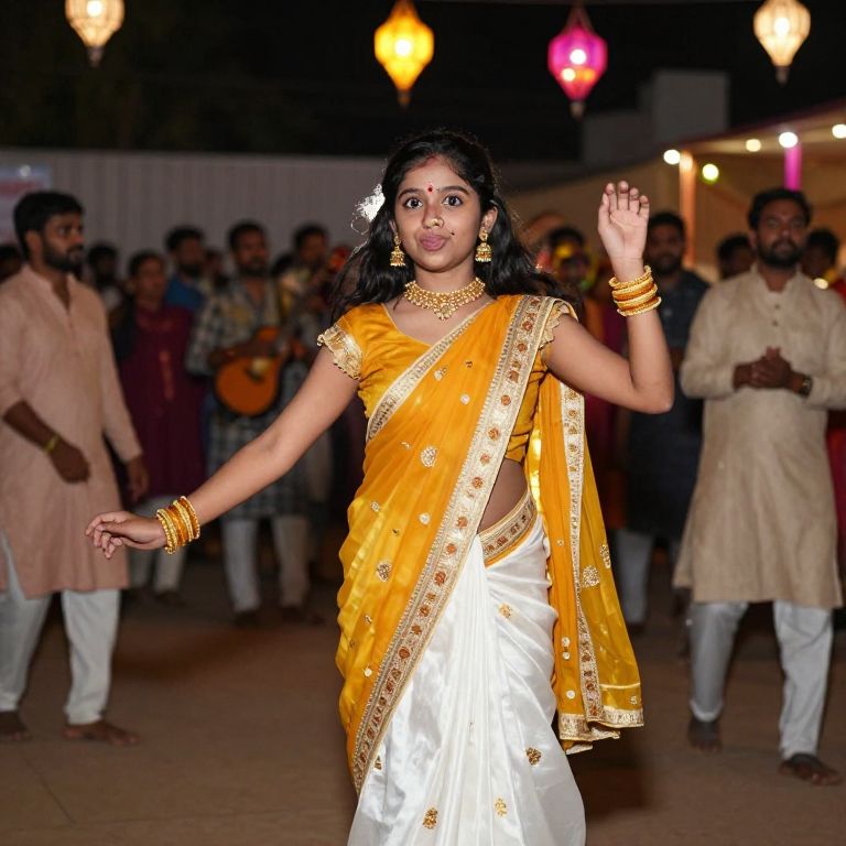 A vibrant girl with round, bright eyes and a playful expression wearing a festive Gujarati saree in saffron and white with delicate border work, dancing in a crowded cultural festival in Surat, with people in traditional attire surrounding her, music playing in the background, and colorful lanterns floating in the air.