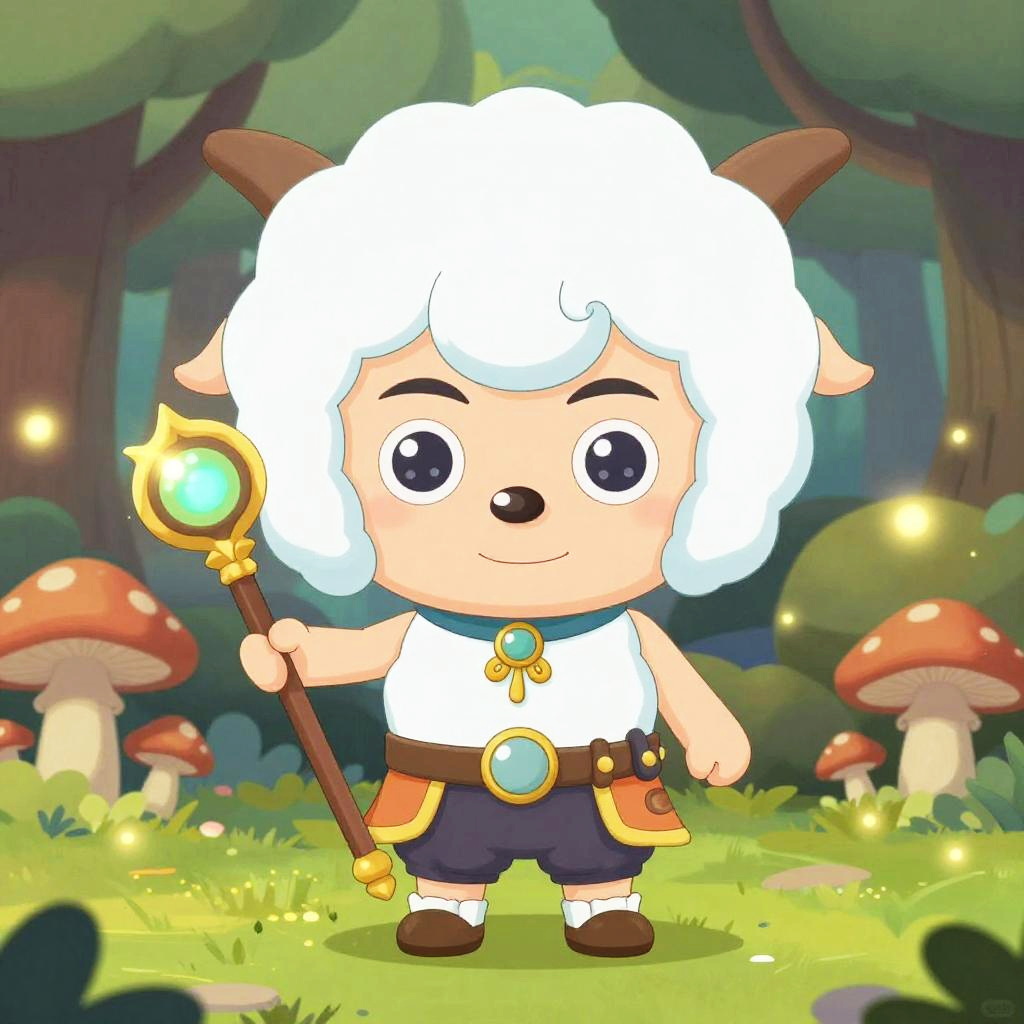 Cute 3d character standing in a colorful fantasy forest, big expressive eyes, smooth shiny textures, vibrant pastel colors, soft lighting, surrounded by floating particles and magical glowing plants, highly detailed and whimsical style.