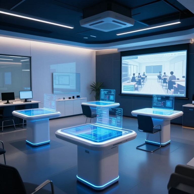 Futuristic schulungsraum with holographic displays, transparent touch tables, ambient blue and white lighting, modular furniture that can rearrange automatically, a wide screen showing virtual classrooms, tech-savvy and innovative learning environment for corporate training.
