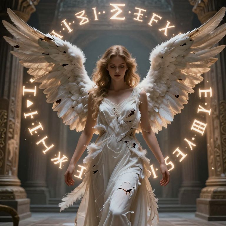 Female angel with broken wings surrounded by glowing runes in an ancient temple, soft ambient light creating a mystical atmosphere, intricate feather details showing damage, ethereal beauty with a hint of vulnerability, high resolution fantasy illustration.