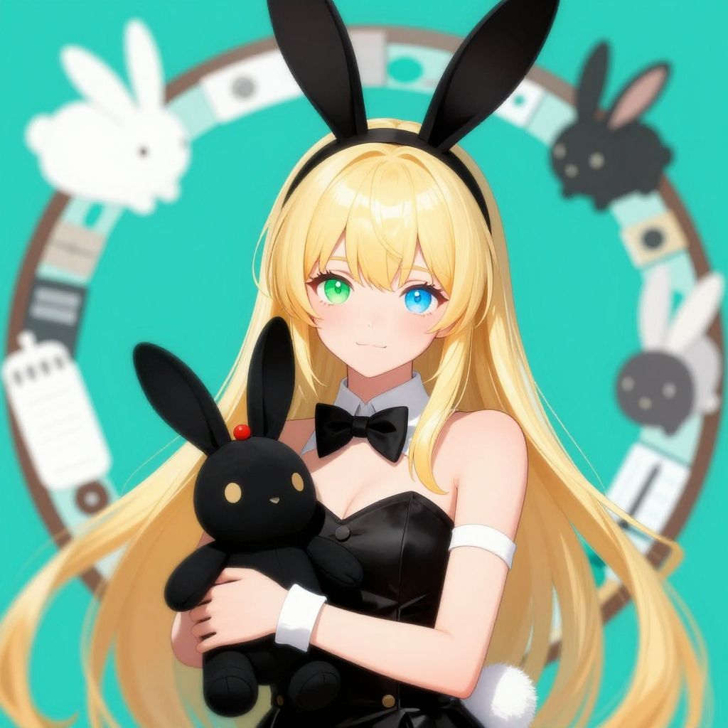 Anime-style digital drawing of a blonde girl with green and blue eyes, black bunny ears, holding a black bunny plushie, against a turquoise background with