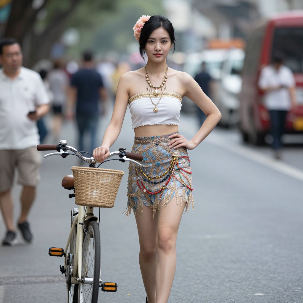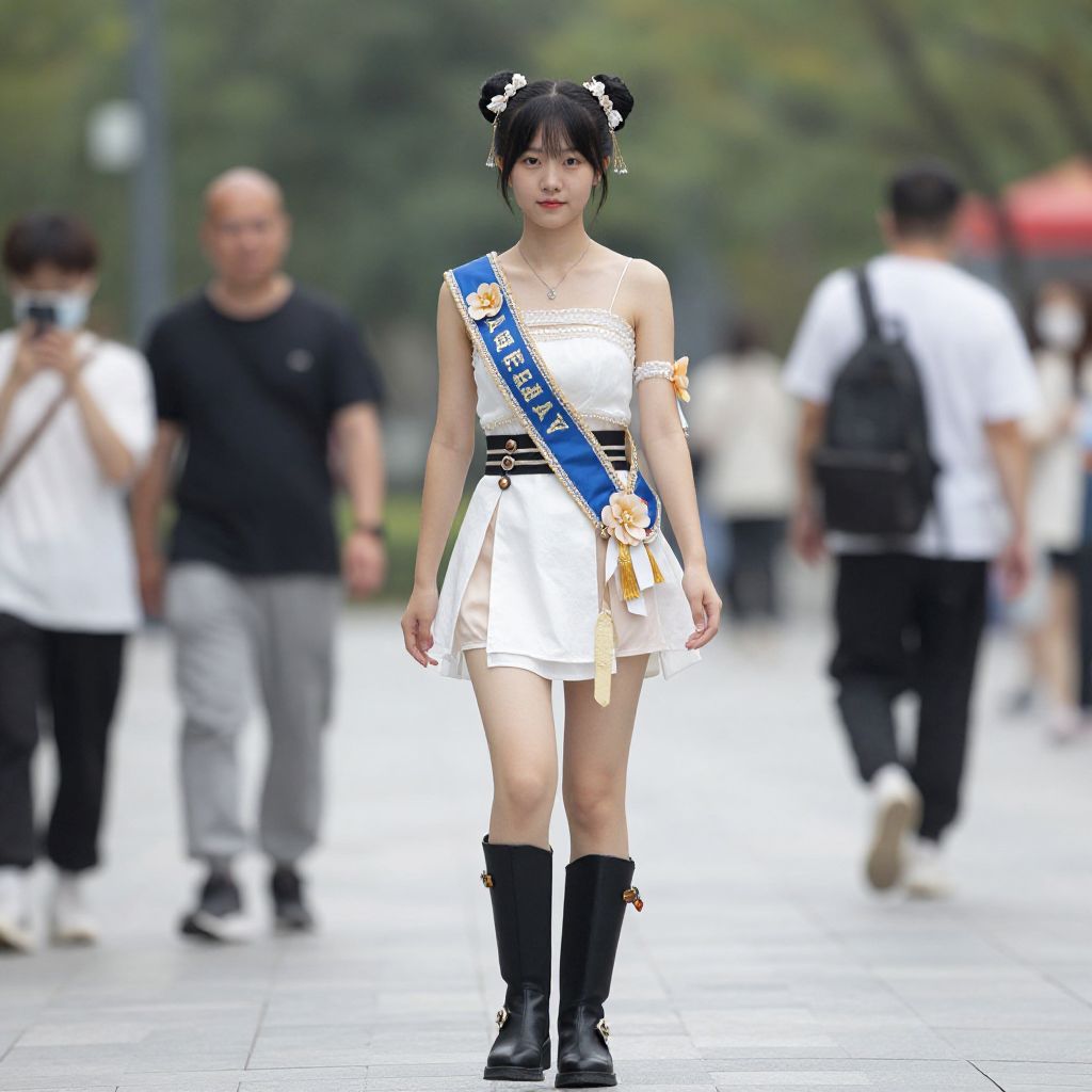 "forplay woman costume, 1girl, solo focus, hair bun, braid, outdoors, boots, black hair, double bun, hair ornament, full body, blurry, sash, flower, 1boy Realistic photo of casual sexy person with pretty face"