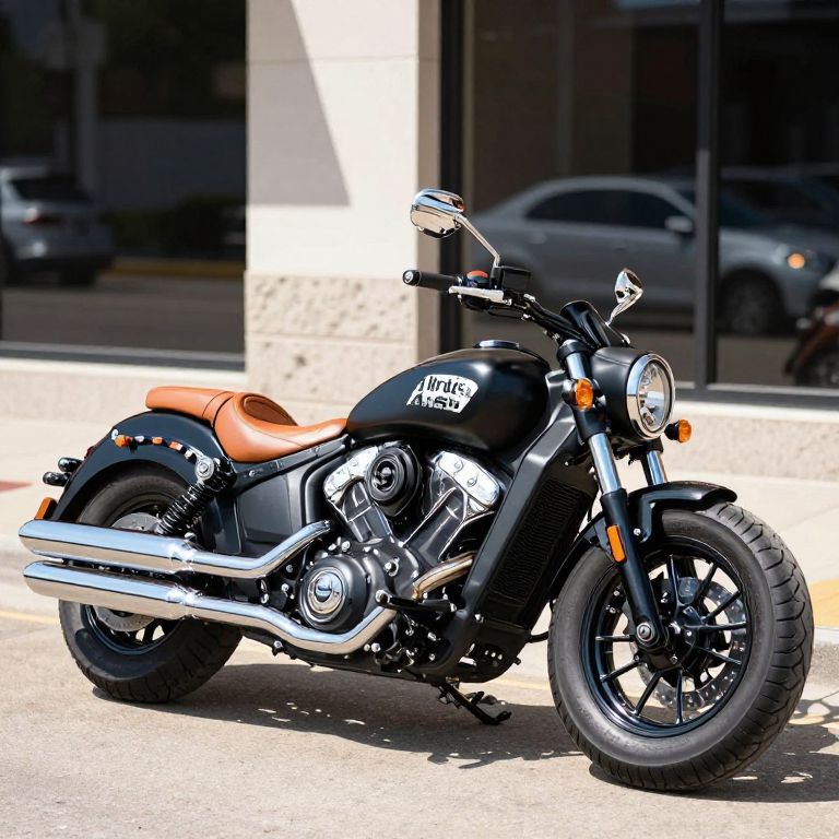 2018 Indian Scout® ABS motorcycle parked outside a storefront in Ottumwa, Iowa, featuring a sleek black frame, orange seat, and chrome accents under bright sunlight.