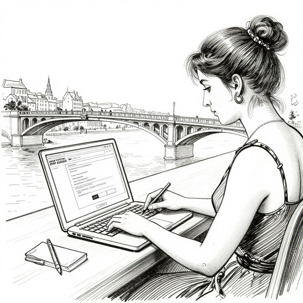 Bridge ink line drawing of a french women designing a website on a laptop white background in the style of the French Dispatch,