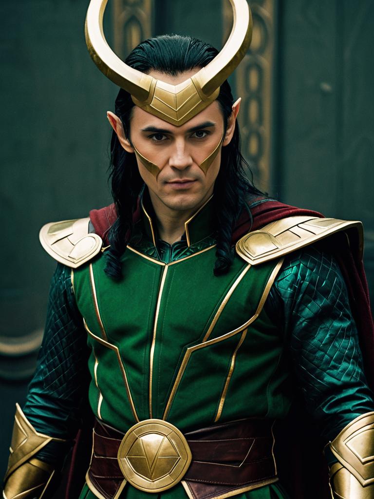 Man in Loki Classic Costume, waist-up editorial photo, photorealistic tones