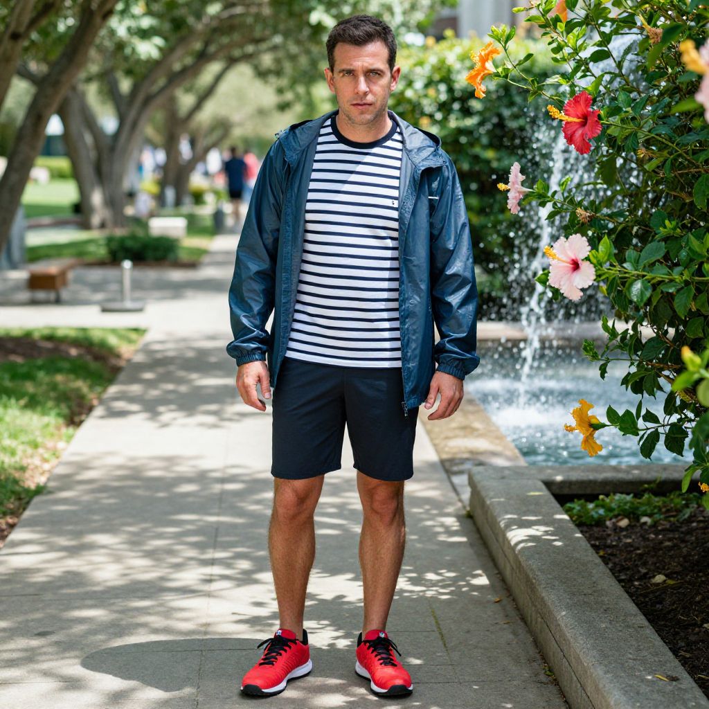 Photograph of a young, fit, Caucasian man standing on a sandy beach. He has short, dark brown hair and a slight stubble. He is wearing a bright red, unzipped, long-sleeve jacket over a white tank top, black athletic shorts, and black sneakers. The background features tall, green palm trees and white buildings with red roofs. The beach is sandy with a clear, bright sky overhead. The man stands with a neutral expression, slightly leaning forward, and his arms hanging loosely by his sides. The image has a slightly exaggerated, almost cartoon-like brightness and contrast.