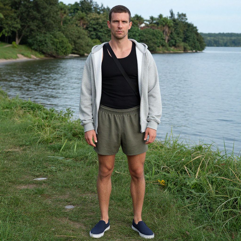 Photograph of a muscular, Caucasian man with short brown hair, wearing a red jacket, white tank top, black shorts, and black sneakers, standing