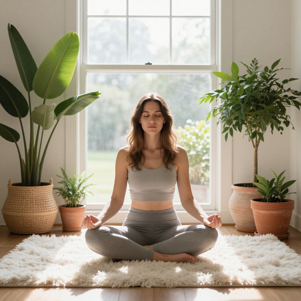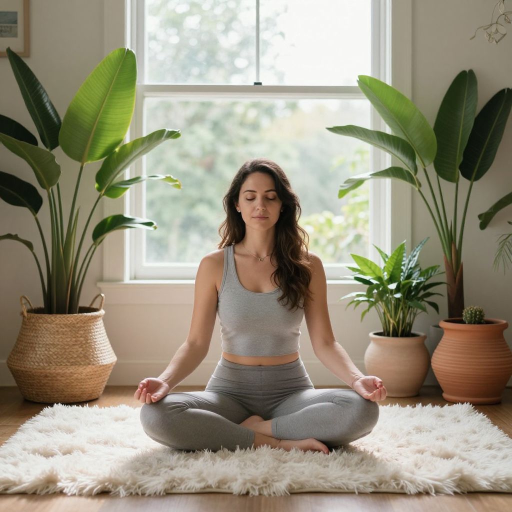 Photograph of a young woman with long, wavy brown hair, sitting cross-legged on a white, fluffy rug in a sunlit room. She wears a grey sports bra and matching high-waisted leggings, with hands resting on her knees in a meditative pose. Behind her, large green potted plants in woven and terracotta pots flank a bright window, casting natural light. Her eyes are closed, and she has a calm, focused expression. The room has a wooden floor and white walls, creating a peaceful, serene atmosphere.