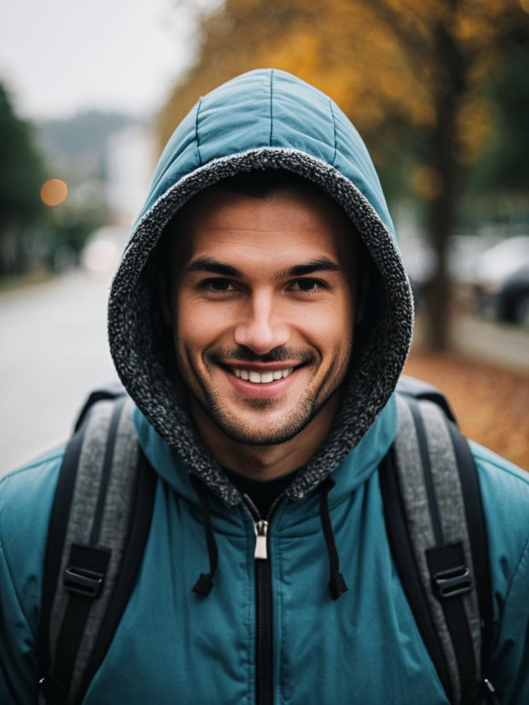 Close-up portrait of a young man with dark hair and a full beard wearing a dark hooded jacket. The man has an intense gaze, looking directly at the camera, with a blurred outdoor background. The hood is up, framing his face, and the jacket has visible drawstrings.