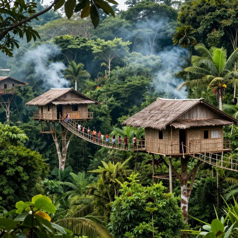 Photograph of a lush, tropical jungle scene with two rustic, thatched-roof wooden houses elevated on stilts, connected by a narrow, suspended rope bridge. A group of people, dressed in red and green, walk across the bridge. Dense green foliage and palm trees surround the houses, with mist or smoke rising from the forest in the background. The vibrant, rich greenery contrasts with the brown thatched roofs and the white rope bridge. The image captures the essence of a tropical eco-lodge or jungle village, blending natural and man-made elements seamlessly.