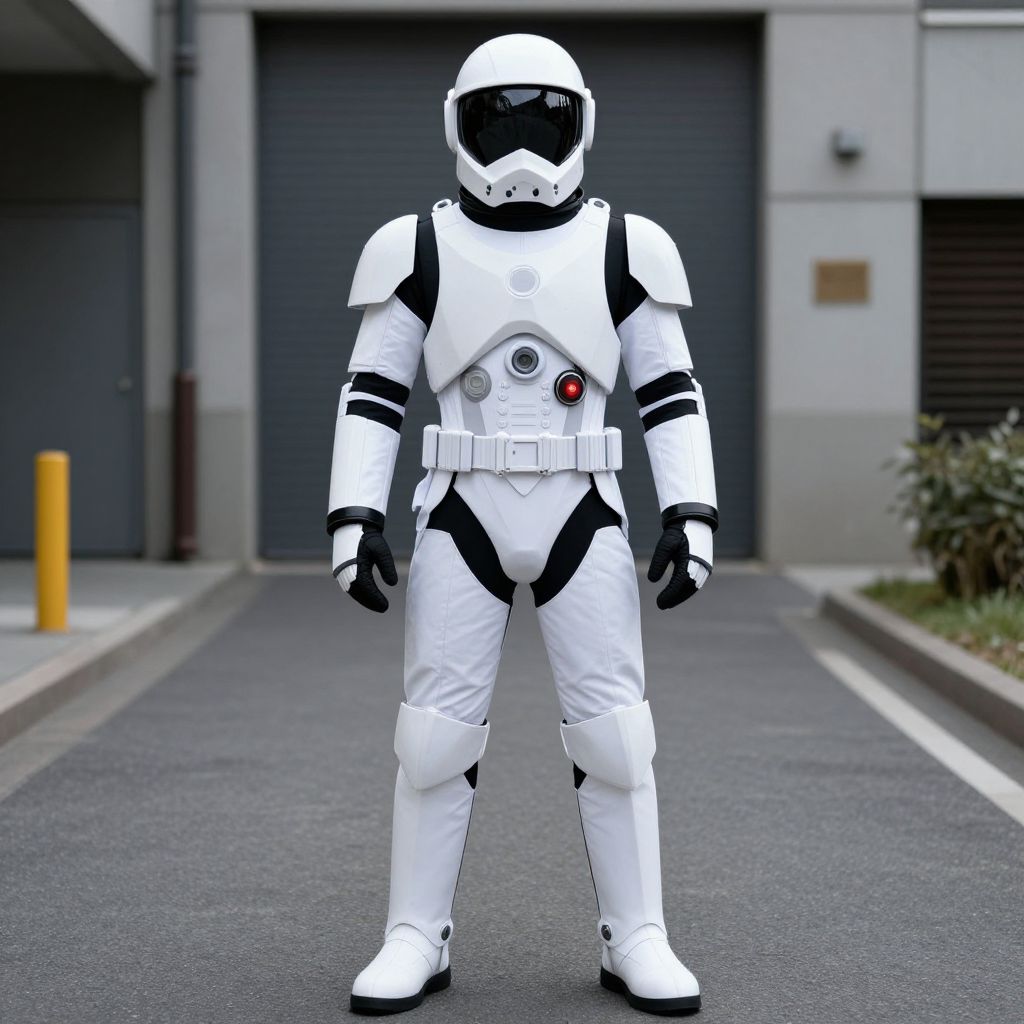 Photograph of a person standing in a parking lot, dressed in a white spacesuit with black accents, including a black helmet with a reflective visor. The suit features two circular control panels on the chest with red and blue lights. The background includes a gray garage door, a yellow bollard, and a small green plant to the right. The person stands on a gray asphalt surface with white lines on either side. The suit's design is reminiscent of sci-fi or space exploration attire. The overall scene is bright and clear, with the subject centered in the frame.
