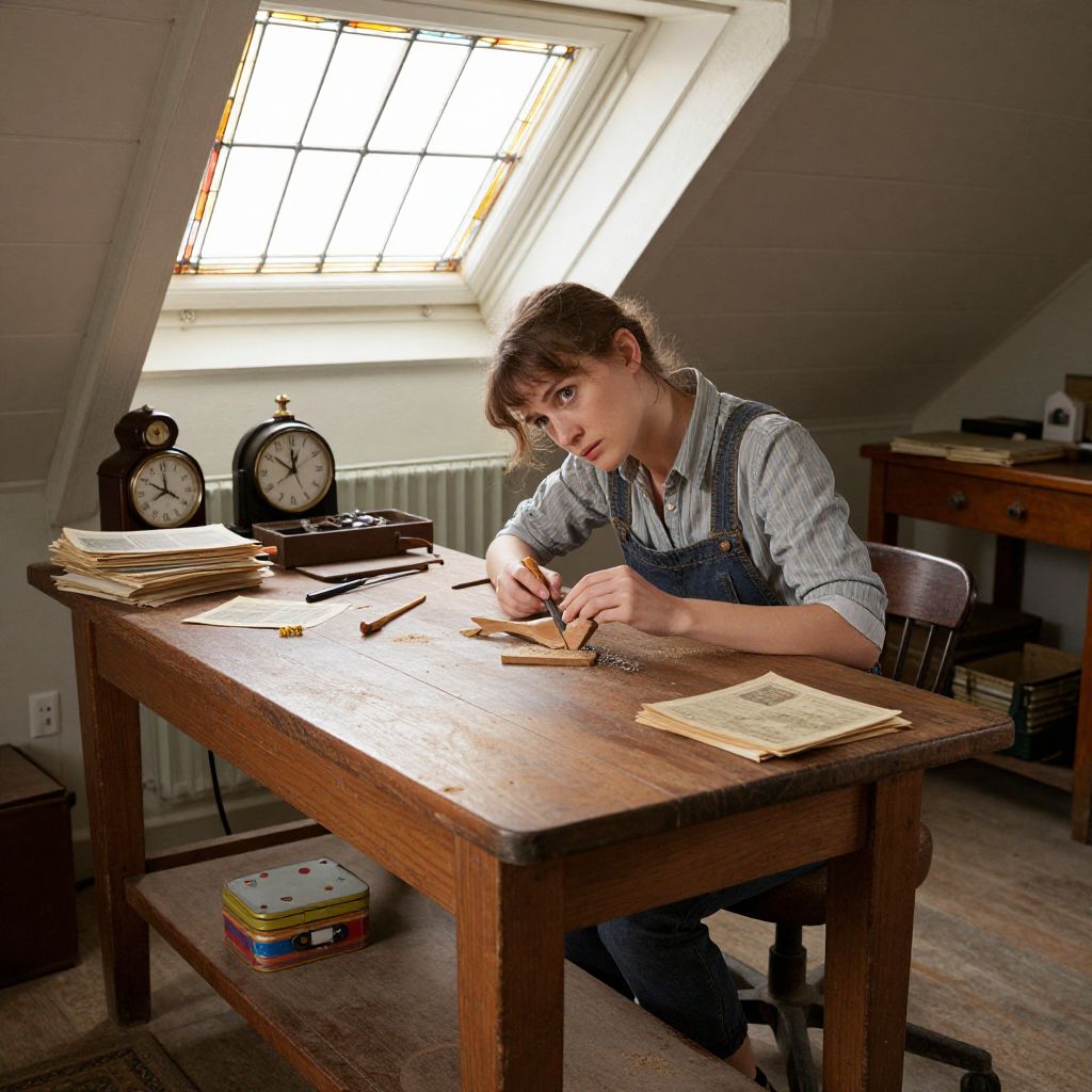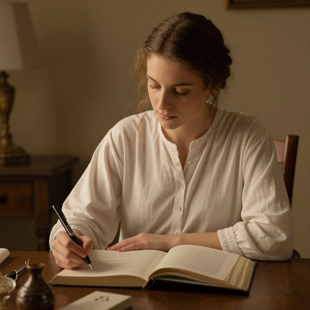 In a quiet room bathed in soft, golden light, a woman sits poised with pen in hand, her gaze fixed on the open book before her—a canvas of thoughts and dreams, where the weight of tradition meets the quiet rebellion of creativity, and the echoes of family history intertwine with the whispers of personal purpose.