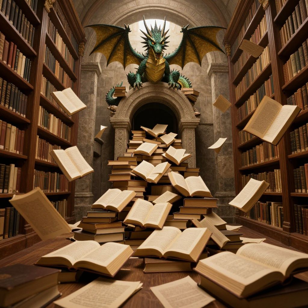 Books cascade in a torrent from the gaping maw of a green, spiky dragon perched atop an ancient stone archway, filling the air and floor of a grand library with their golden pages, each unreadable until touched by human hands.