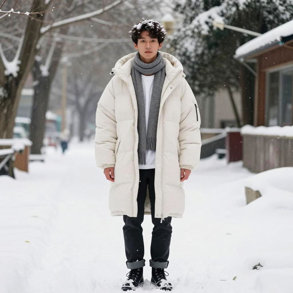 Best quality, ultra high res, (photorealistic:1.4), oversized jacket, white shirt, scarf, coat, winter, full body, snowy
