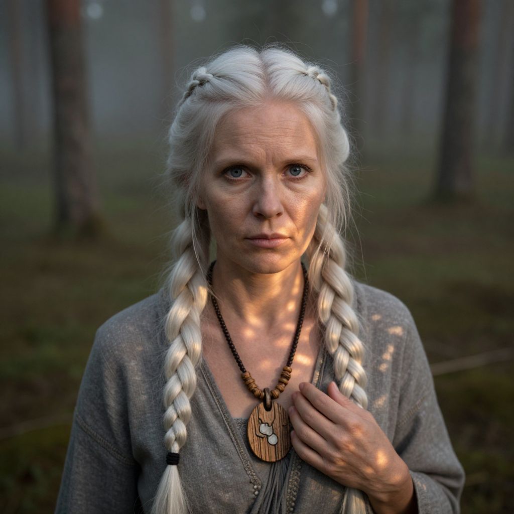 A stoic Slavic woman with striking blue eyes and long braided platinum hair stands in a Scandinavian forest clearing, her ethereal presence framed by mist. Seen from above, her weathered complexion reveals subtle wrinkles around her eyes, hinting at a life of resilience. Soft golden light filters through the trees, illuminating her face while dappled shadows dance across her handcrafted wooden necklace. This portrait evokes reverence for nature and admiration for this enigmatic figure's indomitable spirit as she stands in silent communion with ancient forest spirits.
