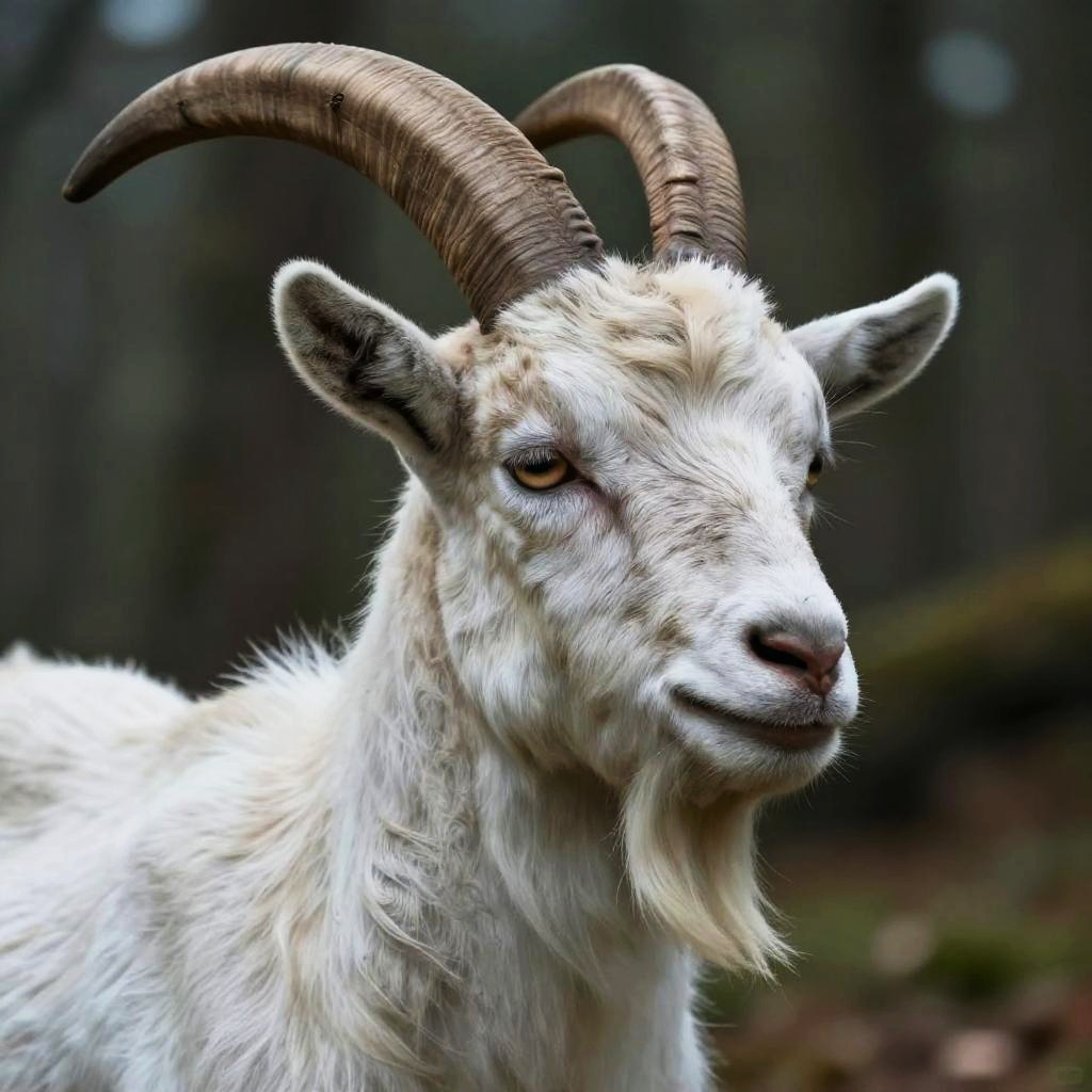 Photograph of a white goat with large, curved, brown horns and fluffy, cream-colored fur. The goat's ears are upright, and its eyes are dark brown. It has a slightly smiling expression with a pink nose. The background is blurred, featuring dark green and brown hues, suggesting a forest setting. The lighting highlights the goat's fur texture, making it appear soft and slightly wavy. The image has a sharp focus on the goat, with a shallow depth of field, making the background appear out of focus.