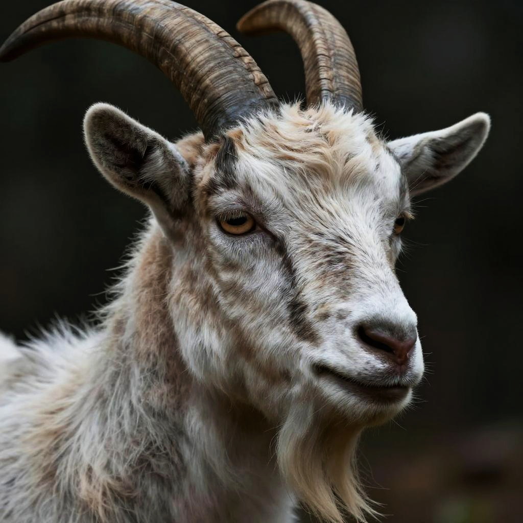 Portrait of a mystical human face goat creature, blending goat’s features with a human expression, elaborate natural textures on fur and skin, ethereal lighting, forest background with soft bokeh, fantasy realism style.