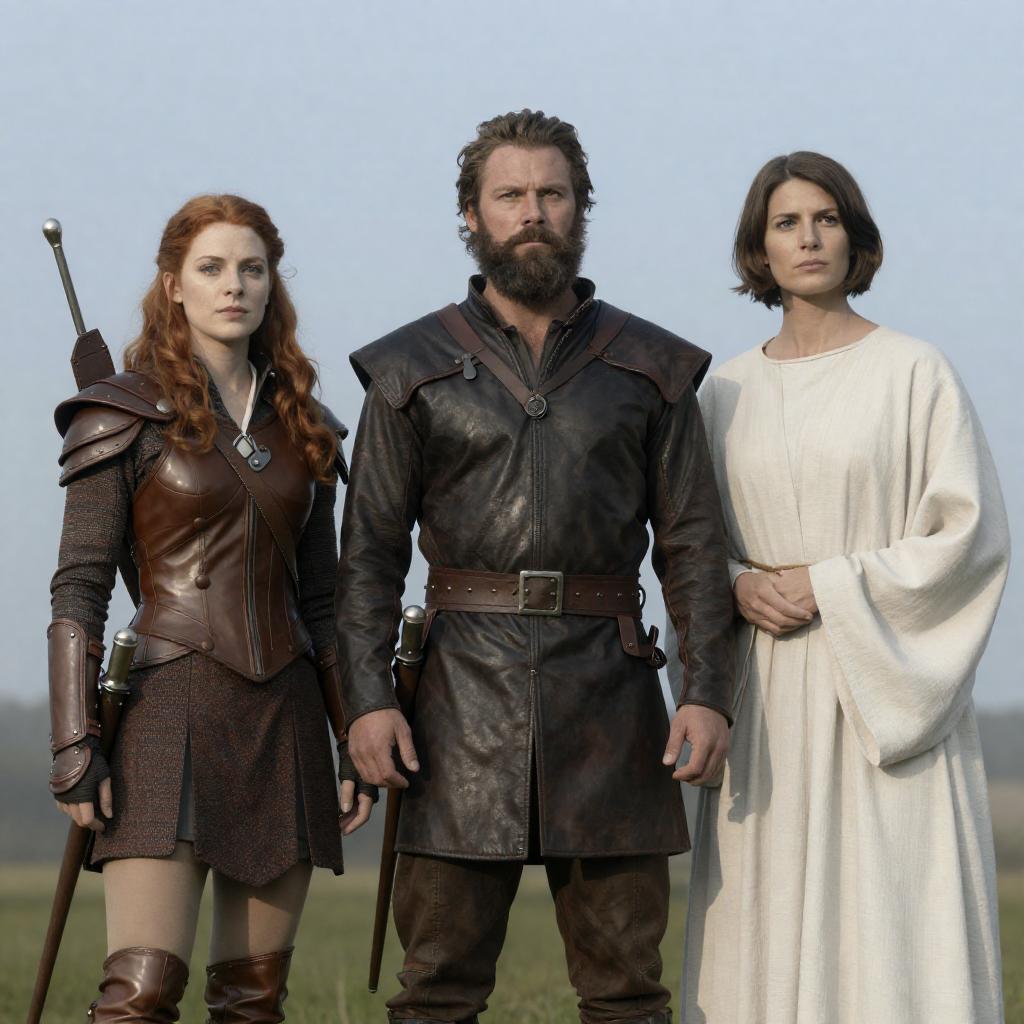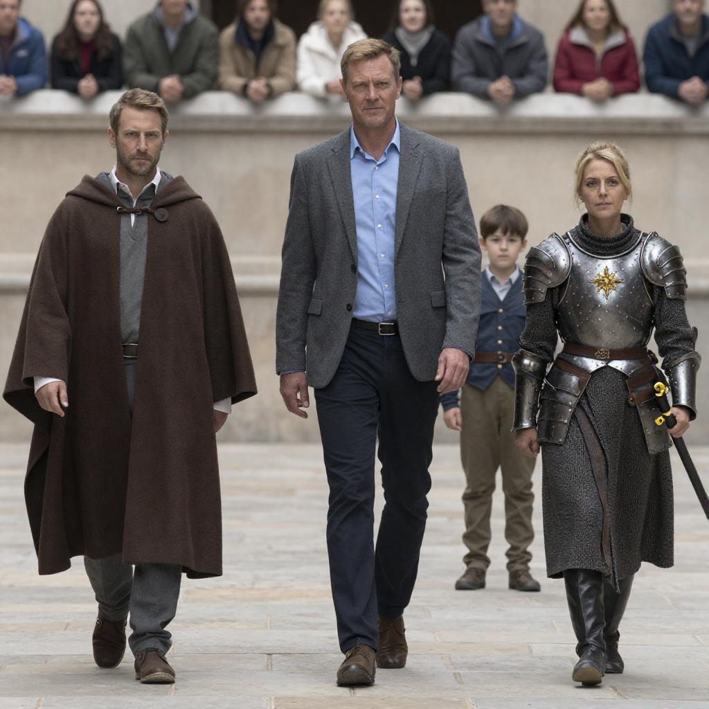 Photograph of four people walking in a stone courtyard. A tall man in a gray blazer and blue shirt stands center, flanked by a man in a brown cloak on the left and a woman in dark armor on the right. A young boy in a vest stands behind them. A crowd watches from above.