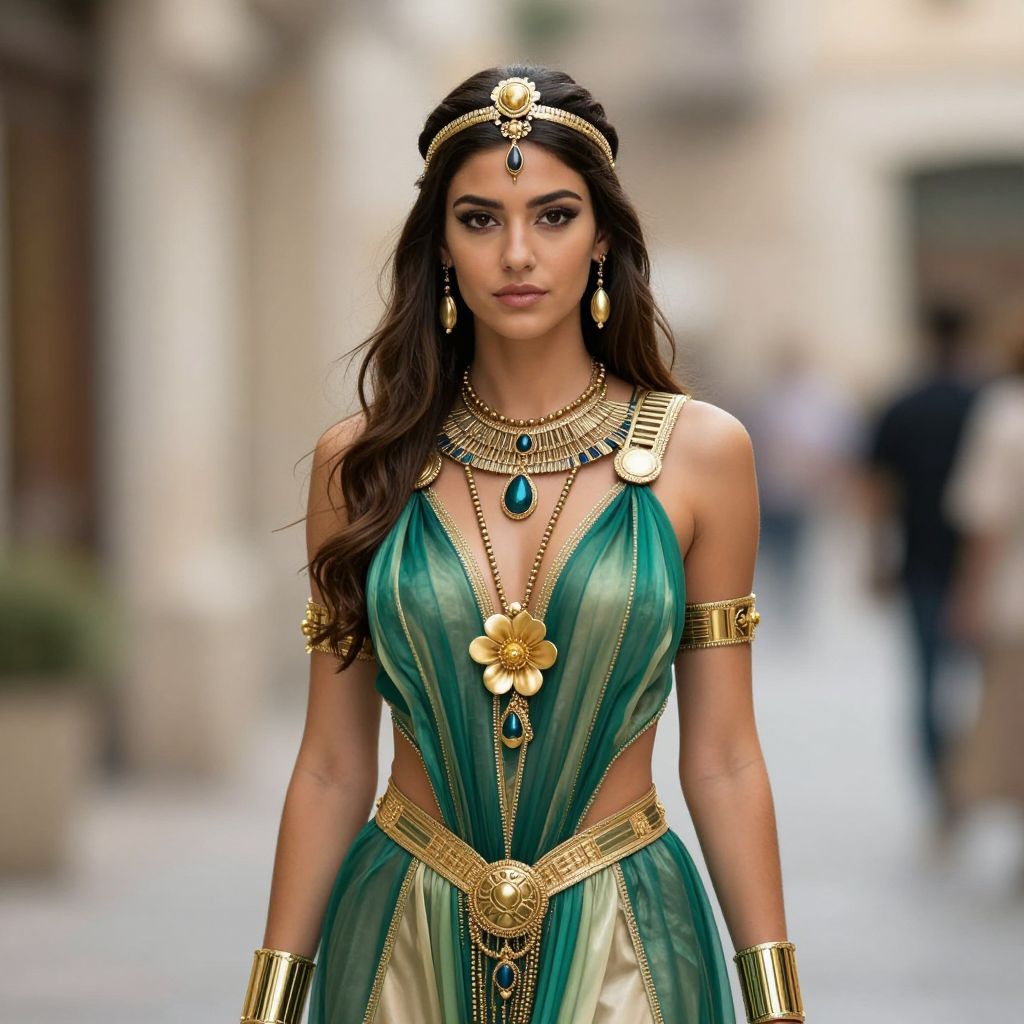 Photograph of a woman with long, wavy dark hair, wearing an ornate, green and gold ethnic dress with sheer fabric and intricate gold jewelry. Her dress features a deep V-neck with a green gemstone pendant, gold arm bands, and a headpiece with a central green gem. She has a serious expression and stands in a blurred, urban street background. Her jewelry includes a large, gold floral brooch and a layered necklace with a green gemstone. The overall style is regal and elegant, reminiscent of traditional Indian or Middle Eastern attire.