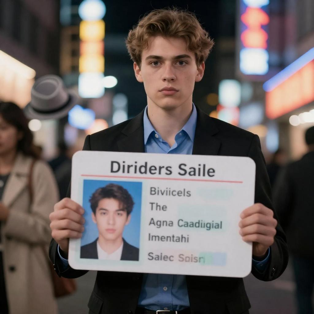 Photograph of a young man with light brown hair, wearing a black suit and blue shirt, holding a large sign with a driver's license photo of himself. Background has bright neon signs. Another person in a beige coat is partially visible on the left, holding a silver hat. The young man's facial expression is intense. Nighttime urban setting.
