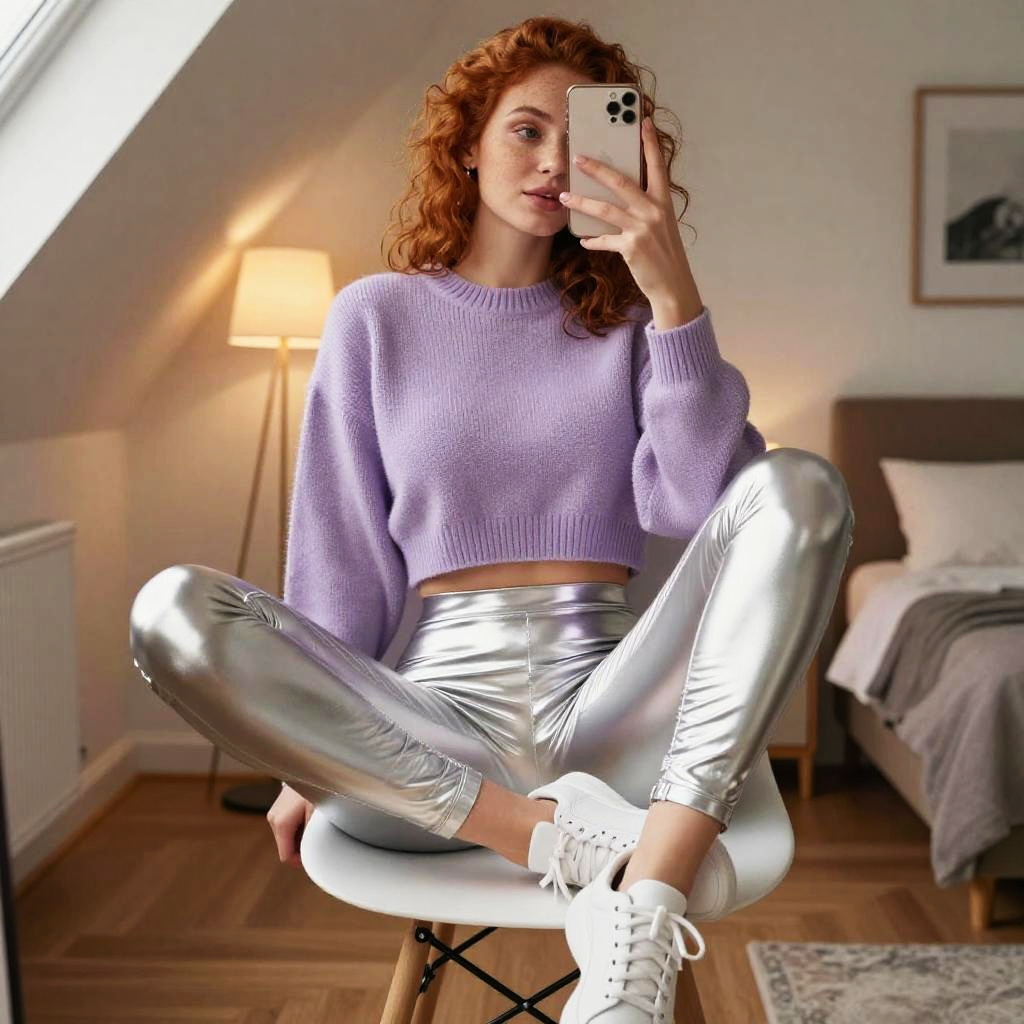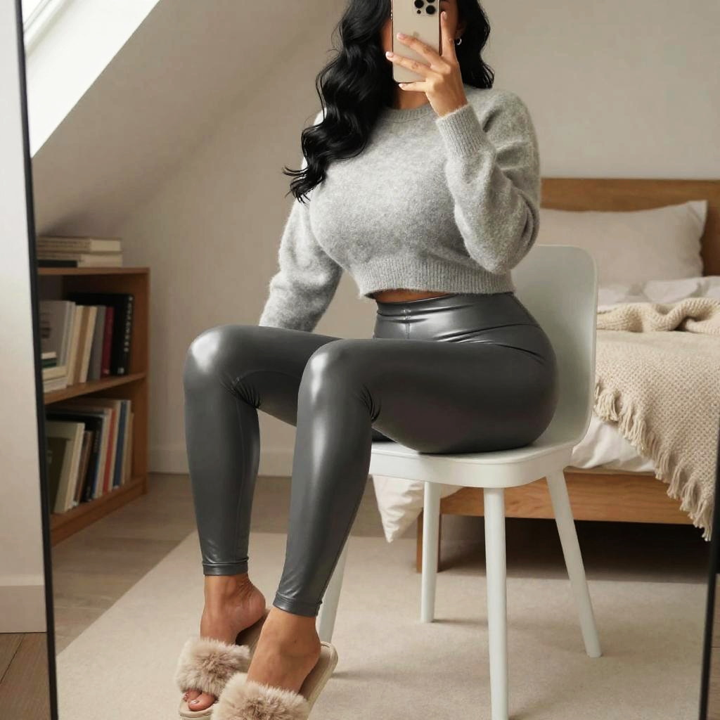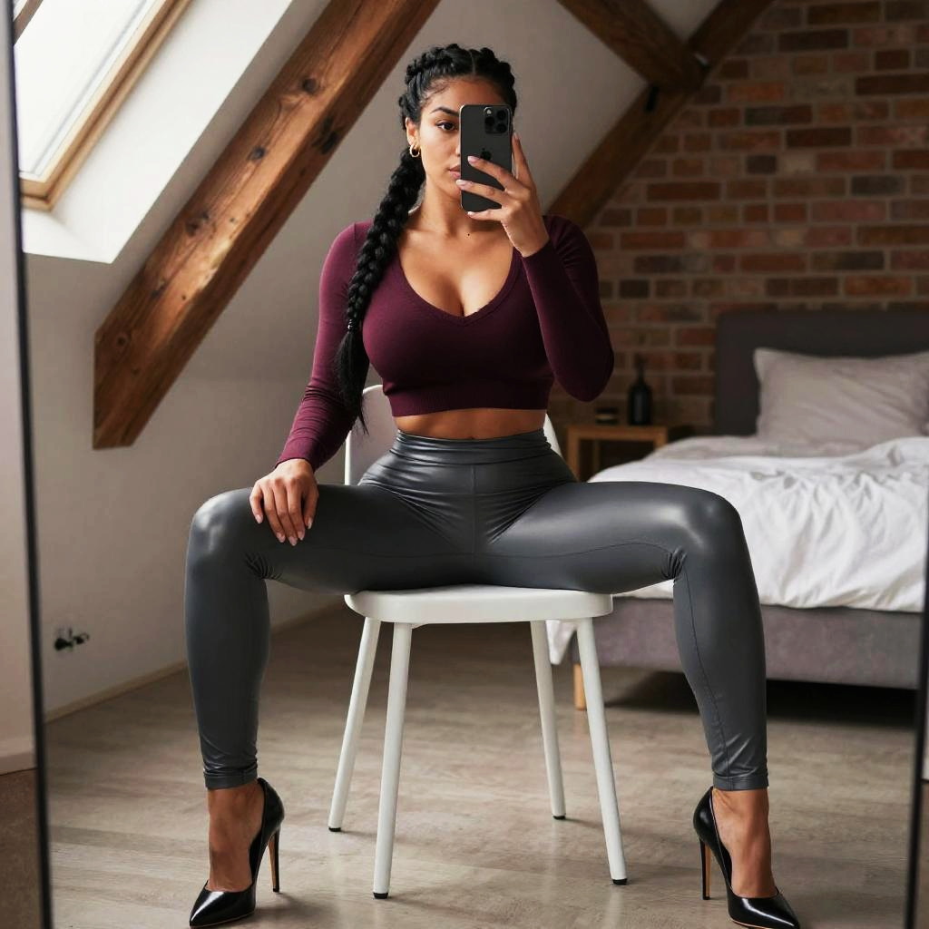 Woman wearing shiny leggings, massive breasts, slim woman with shoulder-length auburn hair and ivory skin taking a mirror selfie, wearing ribbed knit cropped sweater in mustard yellow paired with ultra-glossy midnight navy leggings, bare feet on her feet, seated on a white chair with legs angled toward the camera and phone held up in one hand, cozy attic bedroom interior with decorative fairy lights and scattered books, fashion social-media style photo, high resolution, soft natural light from a nearby window