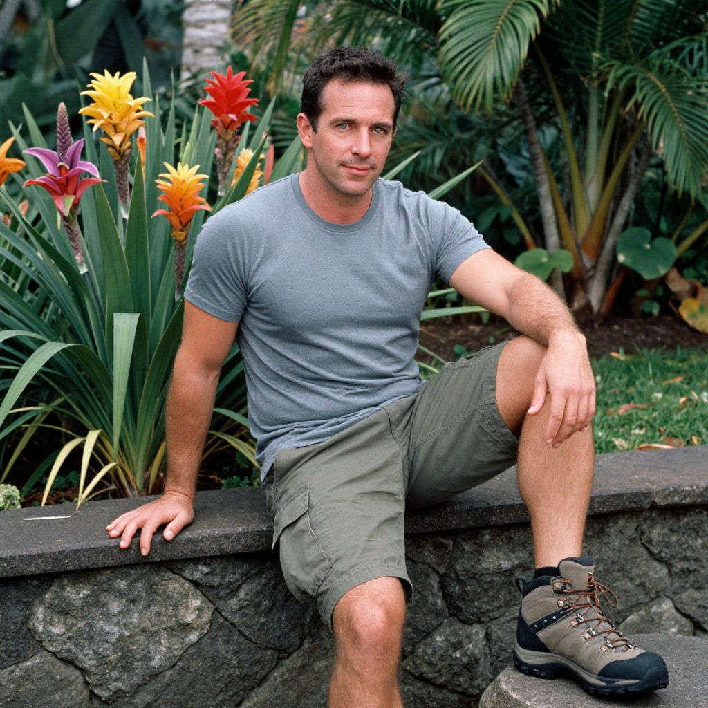 A man, muted green henley shirt, navy blue cargo Bermuda shorts, rugged brown hiking shoes, outdoor-ready style, moss-covered ruins, soft sunlight filtering through branches, Cibachrome, relaxed smile, enjoying nature. Man has masculine face and piercing eyes