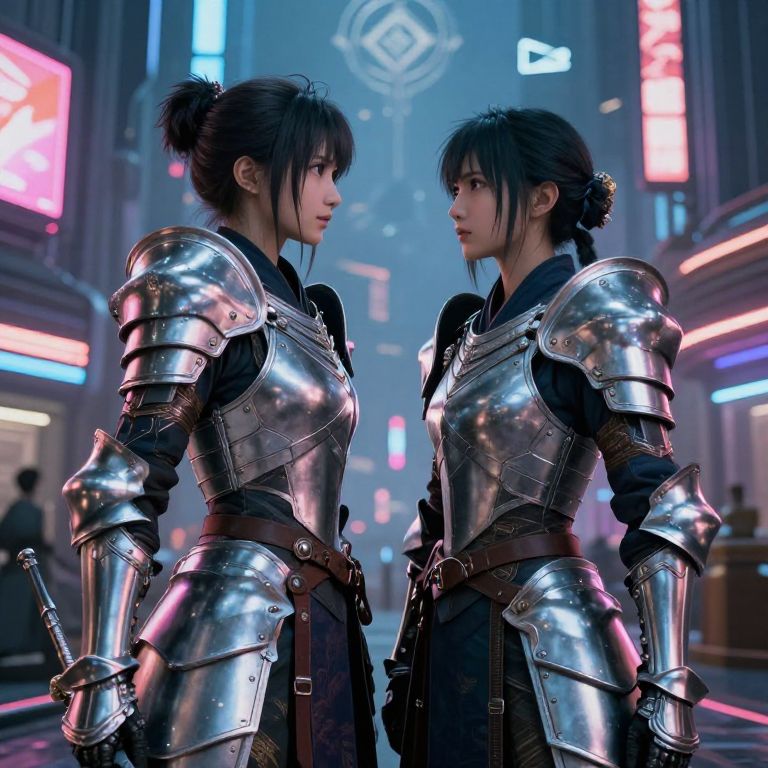 CGI image of two Asian women in shiny silver armor facing each other in a neon-lit, futuristic city street.