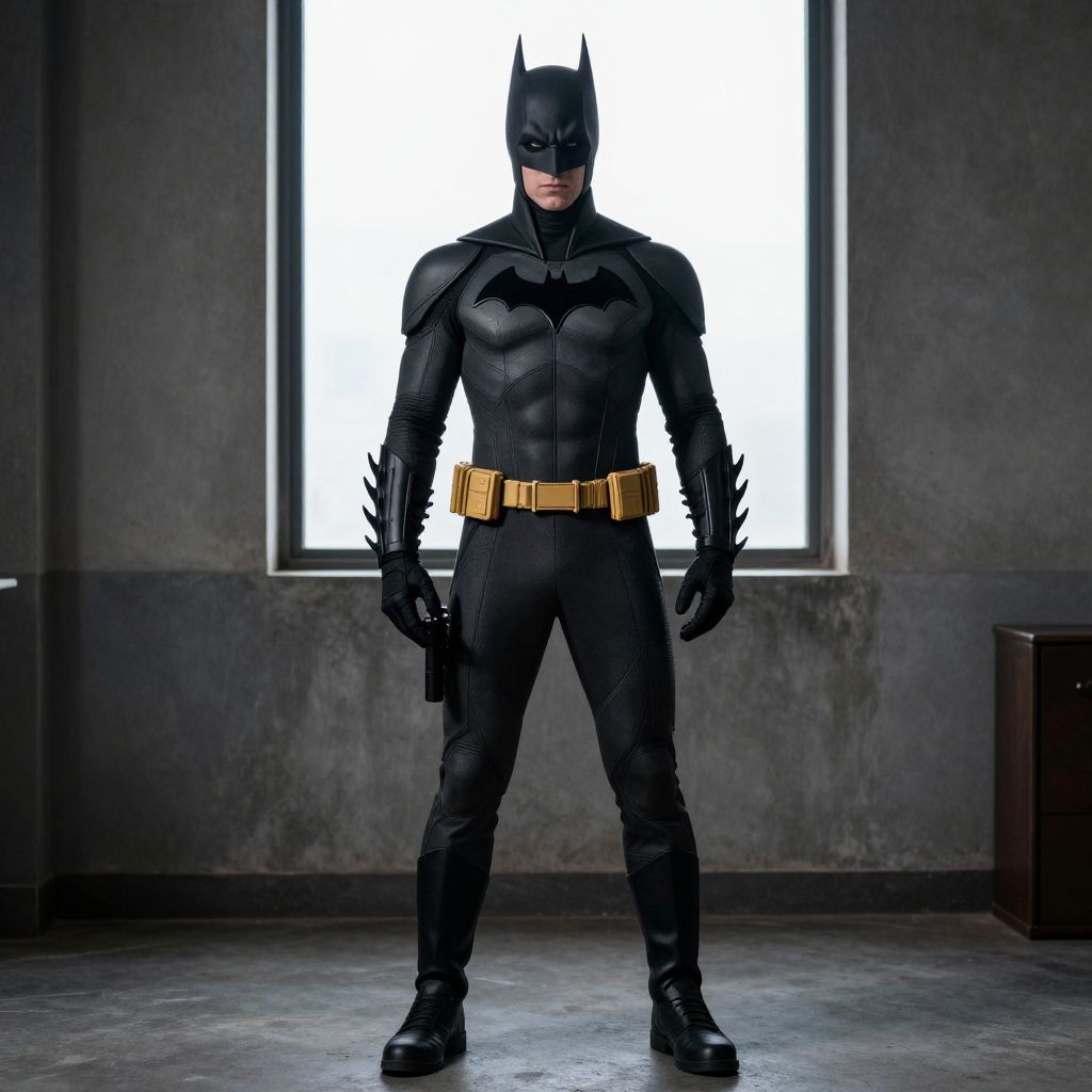 Photograph of Batman in a dark, muscular costume with a bat emblem, golden utility belt, and black mask, standing confidently in front of a bright