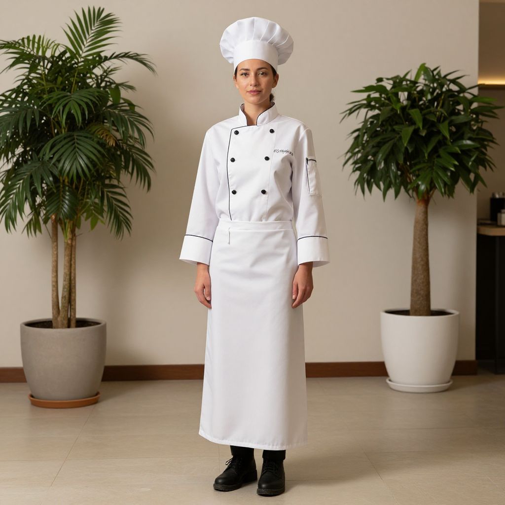 Female Chef Costume, woman in chef's uniform standing in a large room with a potted plant