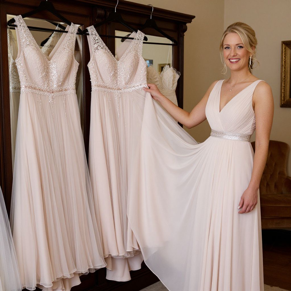 Photograph of a smiling blonde woman with wavy hair in a sleeveless, V-neck, white wedding gown, standing in a room with wooden cabinets. She holds the skirt of her dress, showcasing its delicate lace detail. Three similar white dresses with lace details hang on white hangers in the background. The room has soft lighting, a framed picture on the right wall, and a dark wooden chair partially visible. The woman's dress has a flowing, elegant silhouette.