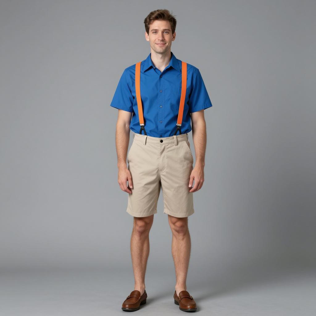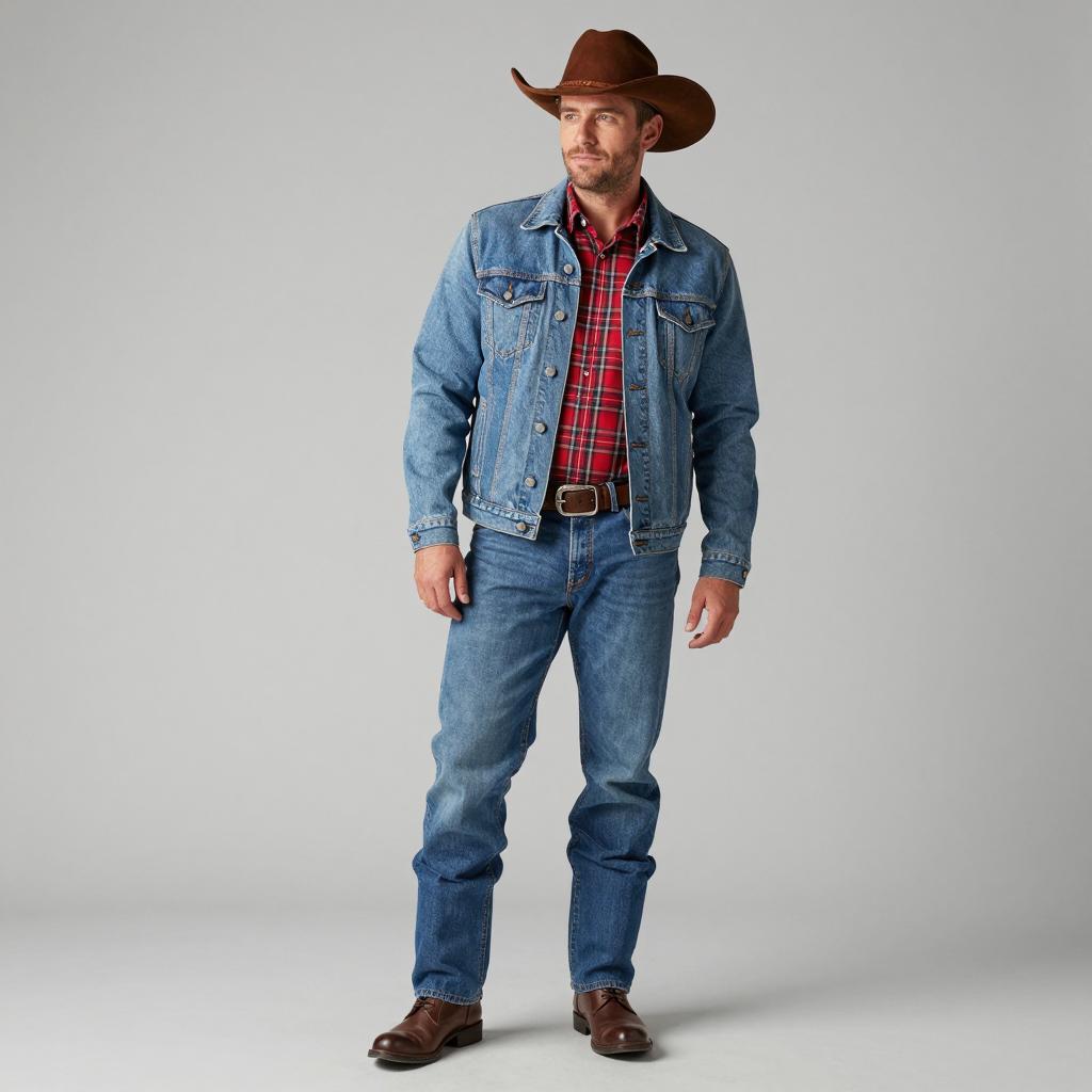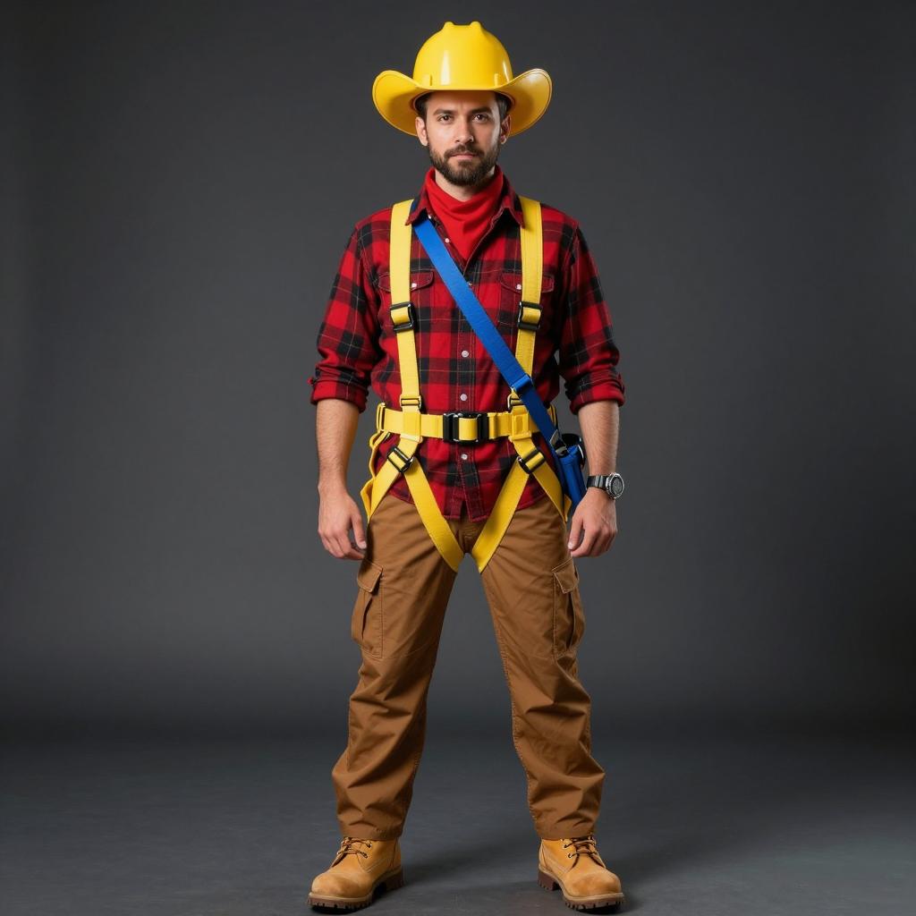 Studio portrait of a man wearing a bright yellow cowboy hat, red plaid shirt, red scarf, yellow safety harness, brown cargo pants, and tan work boots. The man has a beard, a blue crossbody strap, and a wristwatch, standing against a dark background with a neutral expression.