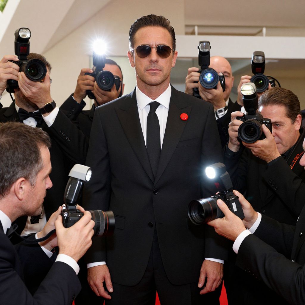 In the center of the image, a famous man dressed in a sleek black suit and sunglasses stands confidently, his face illuminated by the bright flash of a camera. Surrounding him are five Paparazzi, each holding a camera and a flash, their hands raised in unison to capture the moment. The man's suit is adorned with a distinctive red circle, adding a pop of color to his dark attire. The scene is bustling with activity, with the Paparazzi's cameras and flashes creating a dynamic interplay of light and shadow. The overall composition is tightly framed, focusing on the man and the Paparazzi, with the background blurred, emphasizing the intensity of the moment. The image captures the essence of a high-profile event, with the man at the center of attention, surrounded by the relentless pursuit of the paparazzi.