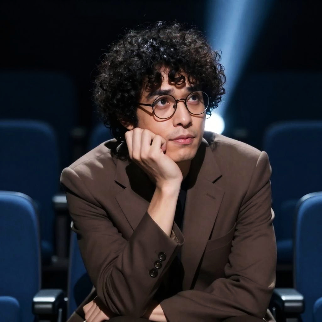 Man with curly black hair, dark sunglasses, brown suit, and white shirt, sitting in blue theater seats, hand near mouth. Dimly lit with a bright light source behind him, creating shadows. Smoky atmosphere. Blue chairs surround him.