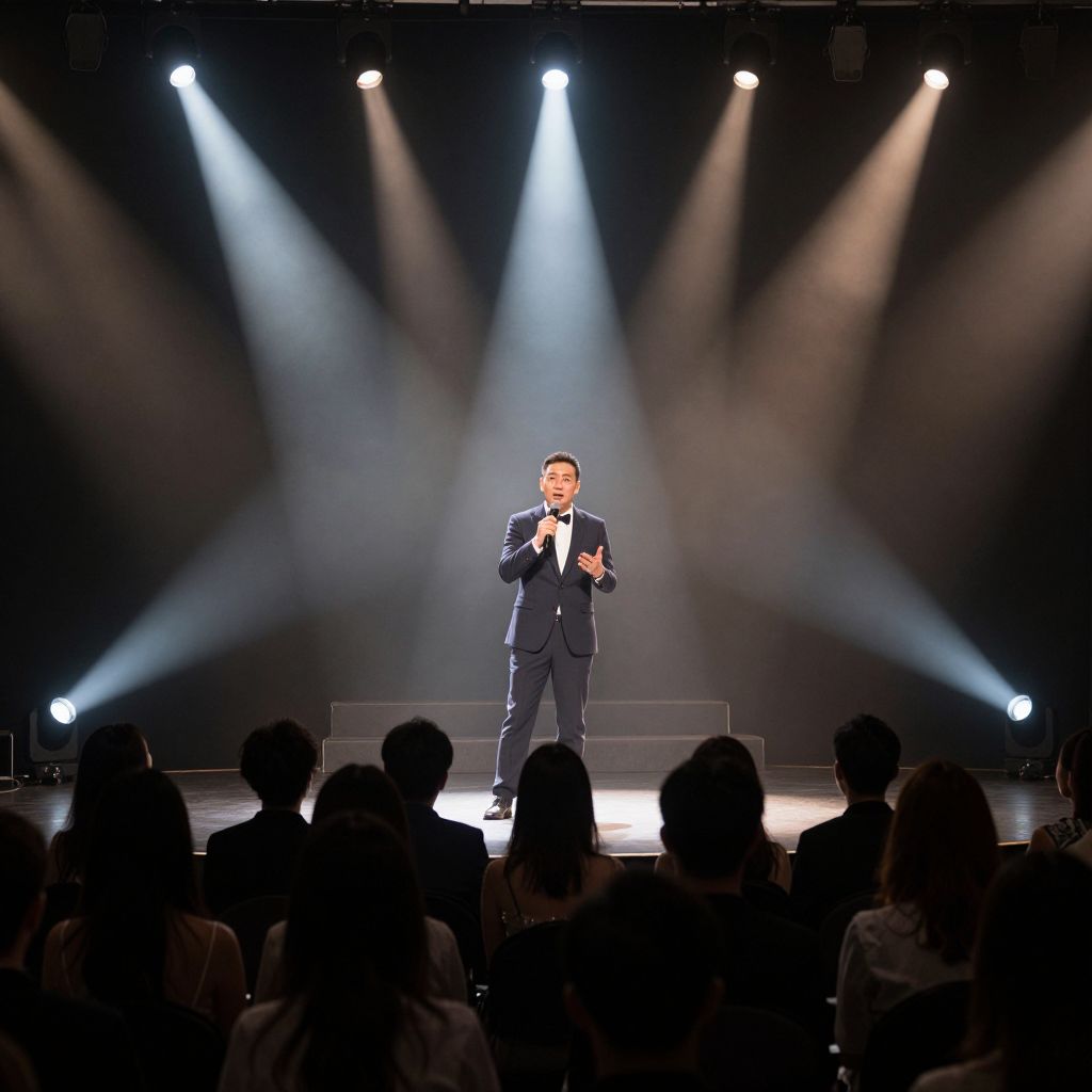A dynamic interplay of dramatic lighting and shadow creates a captivating ambiance as a speaker commands the stage, surrounded by an audience bathed in the soft glow of spotlights, evoking a sense of theatrical elegance and focus.