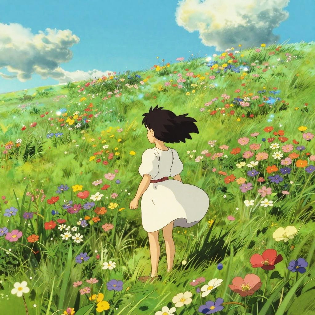 Ghibli AI generator illustrating a spirited young protagonist in a lush meadow, wide-eyed wonder, oversized flowers and playful fantastical animals around, colorful landscape, painterly textures, warm sunlight filtering through trees, capturing a heartwarming fantasy adventure vibe