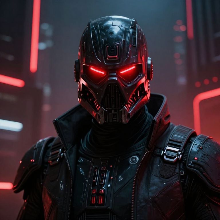Digital sci-fi artwork of a menacing armored figure with glowing red eyes, black helmet, and futuristic black gear, set against a neon-lit, cyber